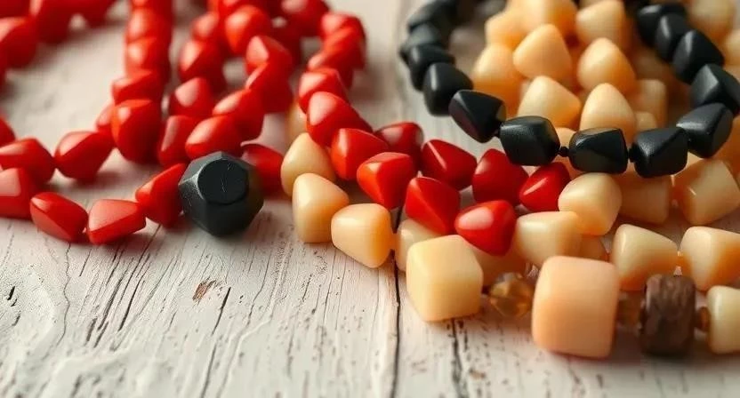 - Бакелитовые бусы: яркие цвета и геометрические формы, характерные для 1930-х годов.