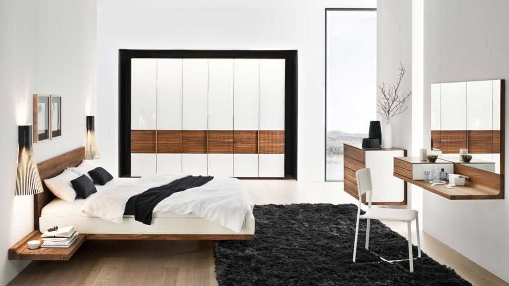 Чаще всего для оформления используют 2-3 цвета. Стены делают светлыми, устанавливают контрастную мебель. Например, в белой спальне делают черный или красный пол и кровать. В помещении устанавливают только один предмет мебели. Хорошо смотрится лаконичная картина, повешенная над ложем, и устанавливают 1-2 простых осветительных прибора.