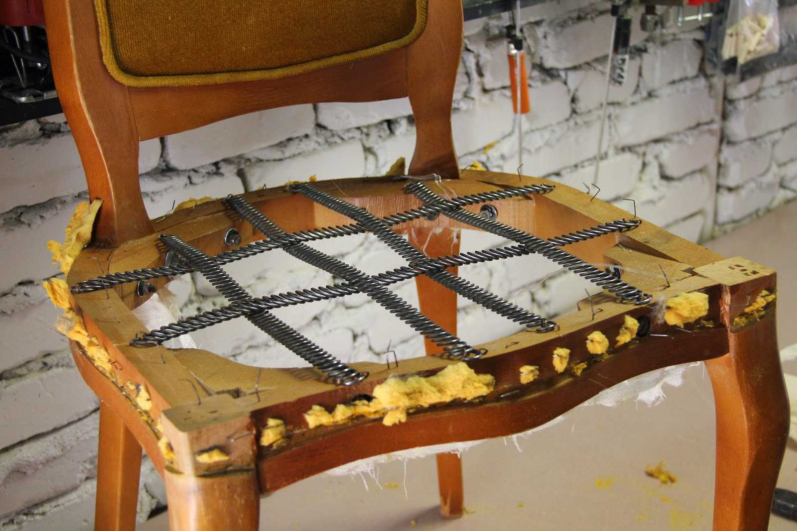 Если есть необходимость в небольшом ремонте каркаса стула или пружин, нужно их выполнить. Трещины стоит залить клеем или герметиком и зашпаклевать.