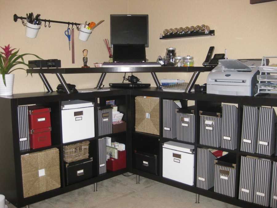 Комбинирование письменного стола с надстроенными полками, шкафчиками, боксами создает своеобразный модульный комплекс, удобный для работы и хранения необходимых принадлежностей. Подобный модуль выполняется в едином стиле и очень компактен. Часто его используют там, где необходимо размещение компьютерной системы в сочетании с рабочим местом.