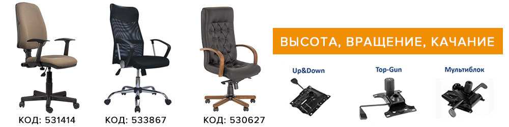 Все кресла на пятилучевых опорах имеют подъемно-поворотный механизм (газовый лифт/газовый патрон) для регулировки высоты кресла и обеспечения его вращения.
