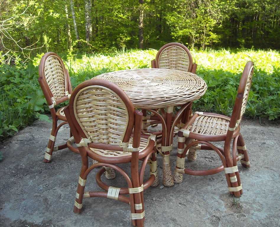 - даже многократное пребывание под влиянием осадков не повлияет на внешний вид и характеристики садовой мебели. Ее можно смело оставлять на открытом воздухе – ничего не случится. На искусственных прутьях царапины незаметны. Можно не бояться сколов краски. Так как прокрас идет в массе;