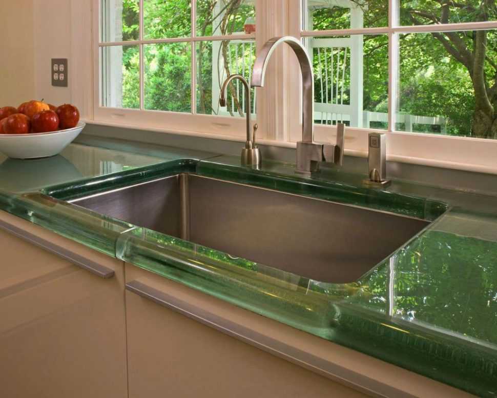 Богатый и необычайно красивый вид имеют стеклянные столешницы, популярность которых никогда не угасает.
