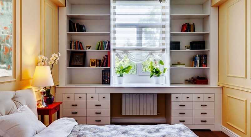 В спальне тоже можно устроить мини-кабинет или превратить место у окна в туалетный столик. Хорошая идея — продлить подоконник по всей стене: тогда на нём можно будет разместить и комнатные растения, и красивый декор.