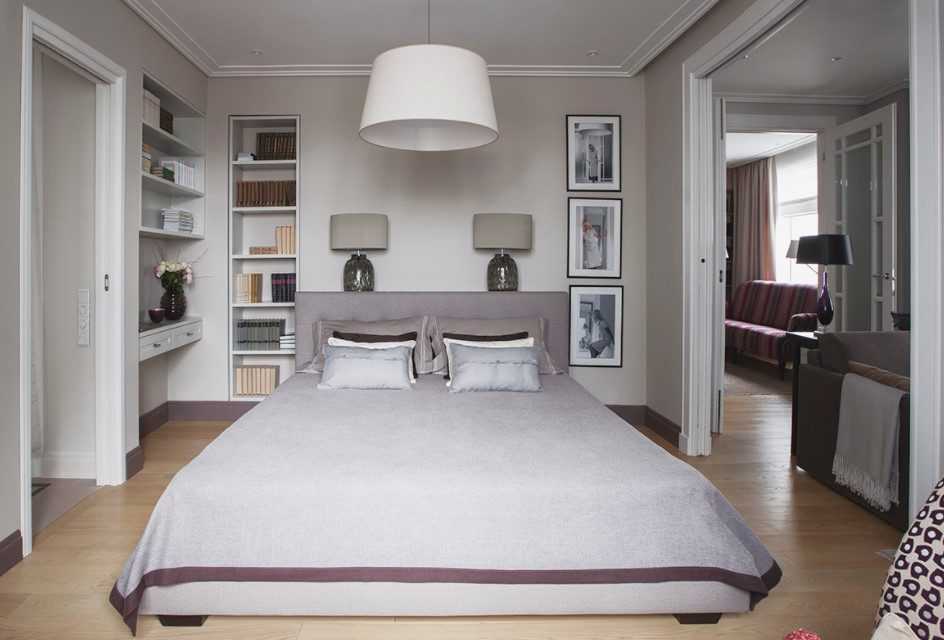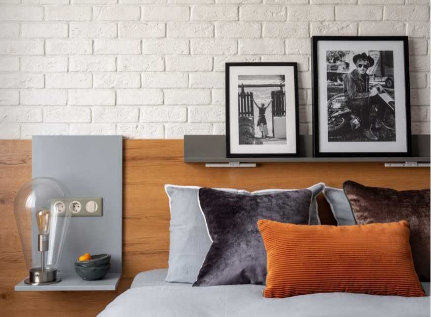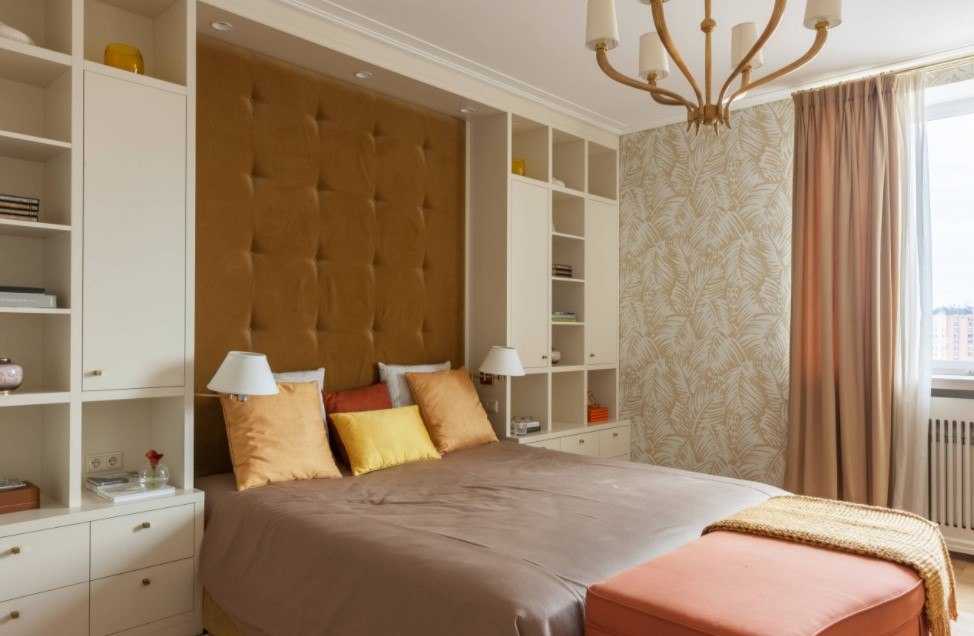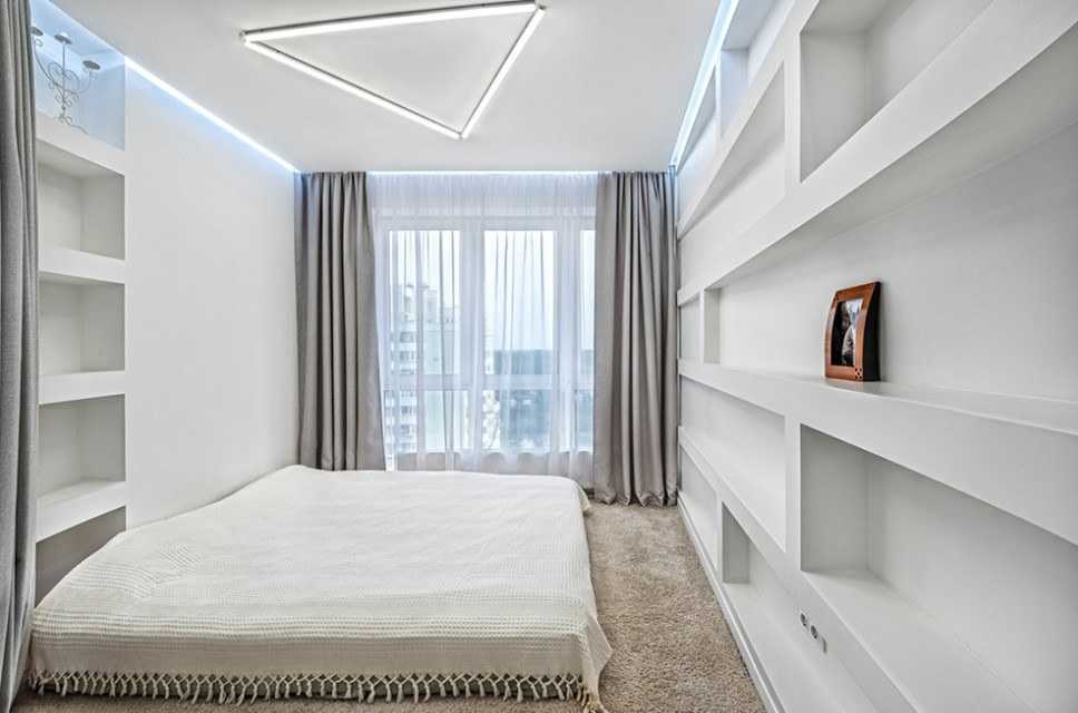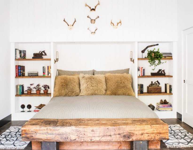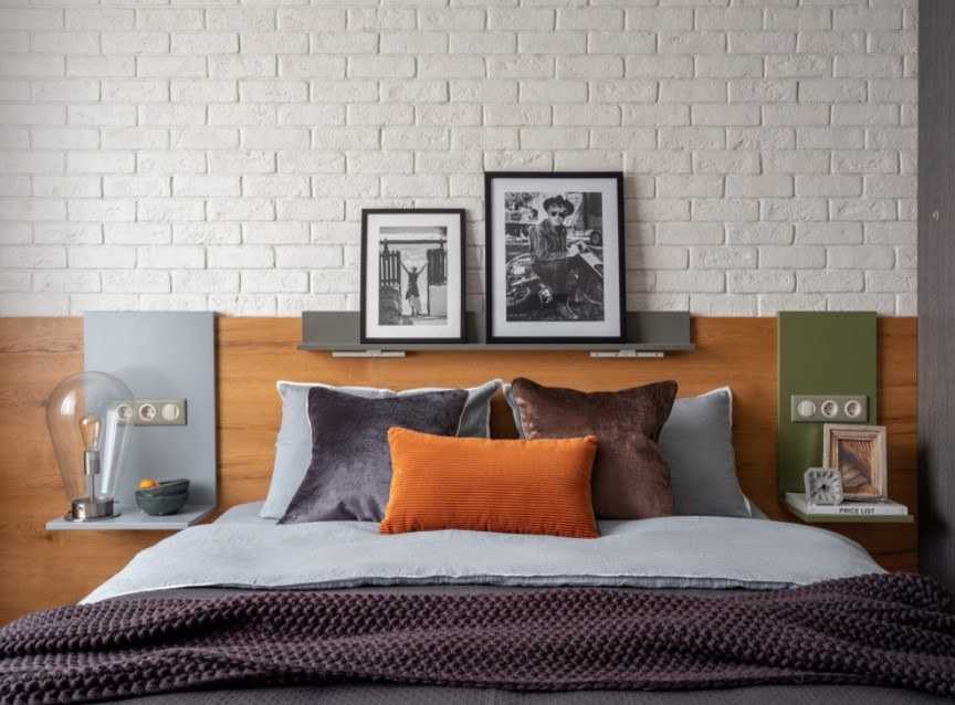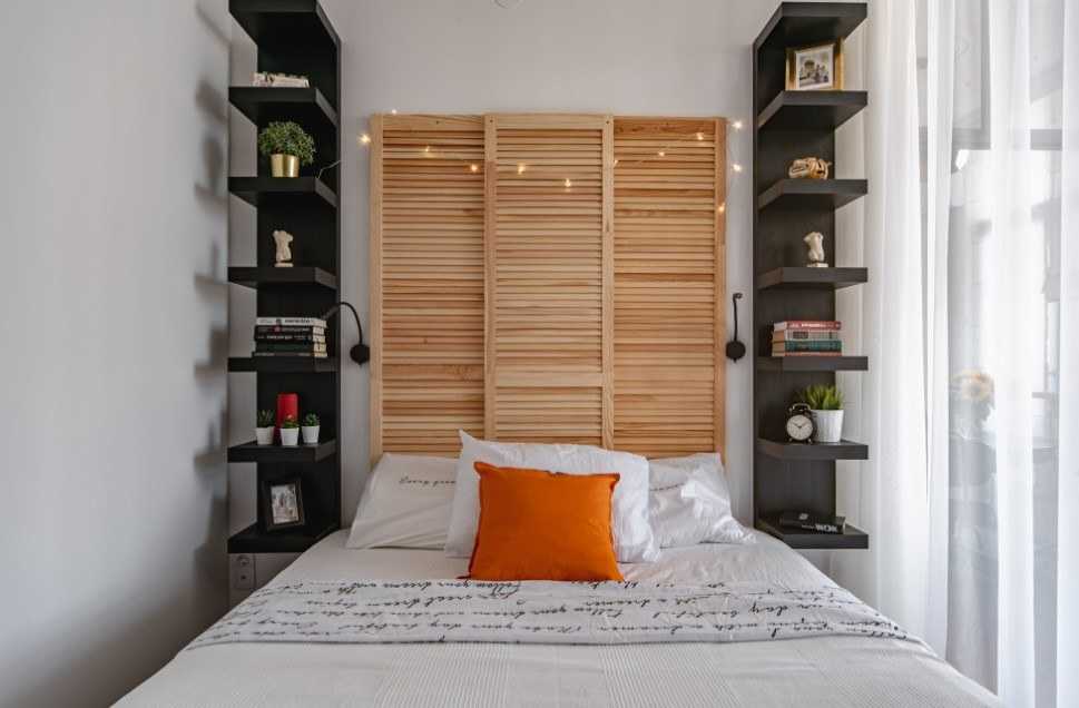 Прямоугольную полку можно разместить между двумя шкафами, стоящими по обеим сторонам кровати