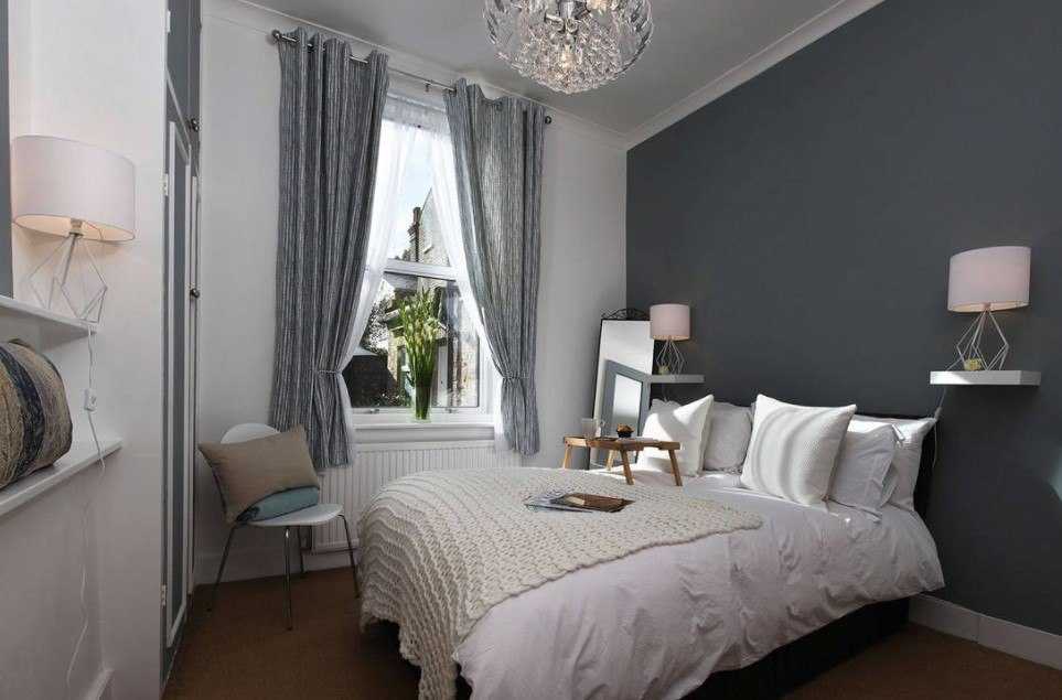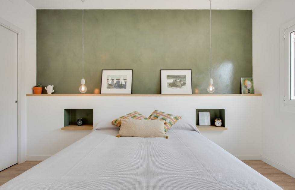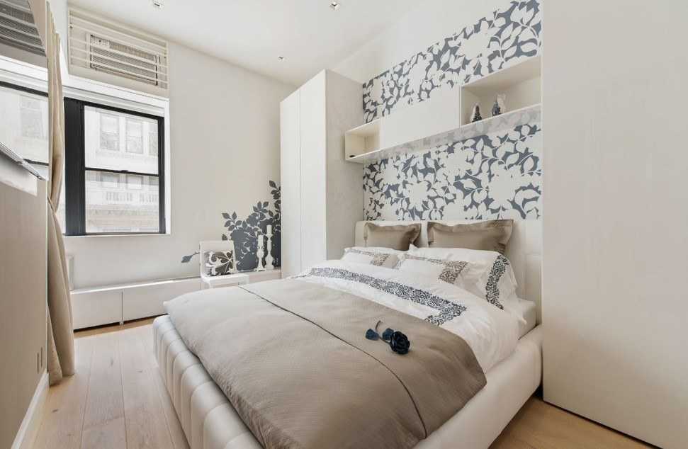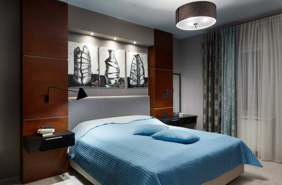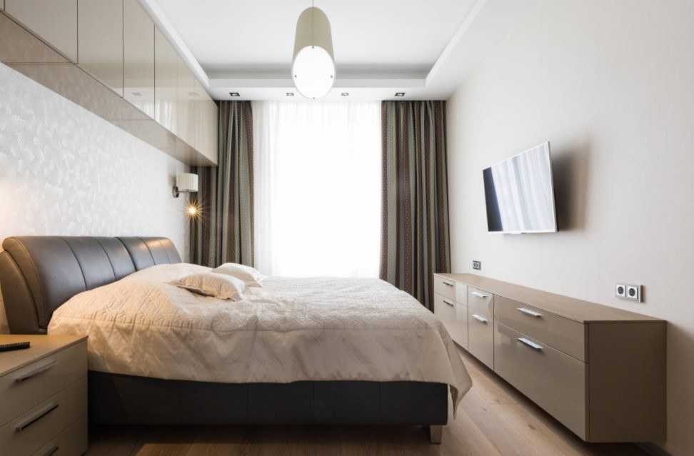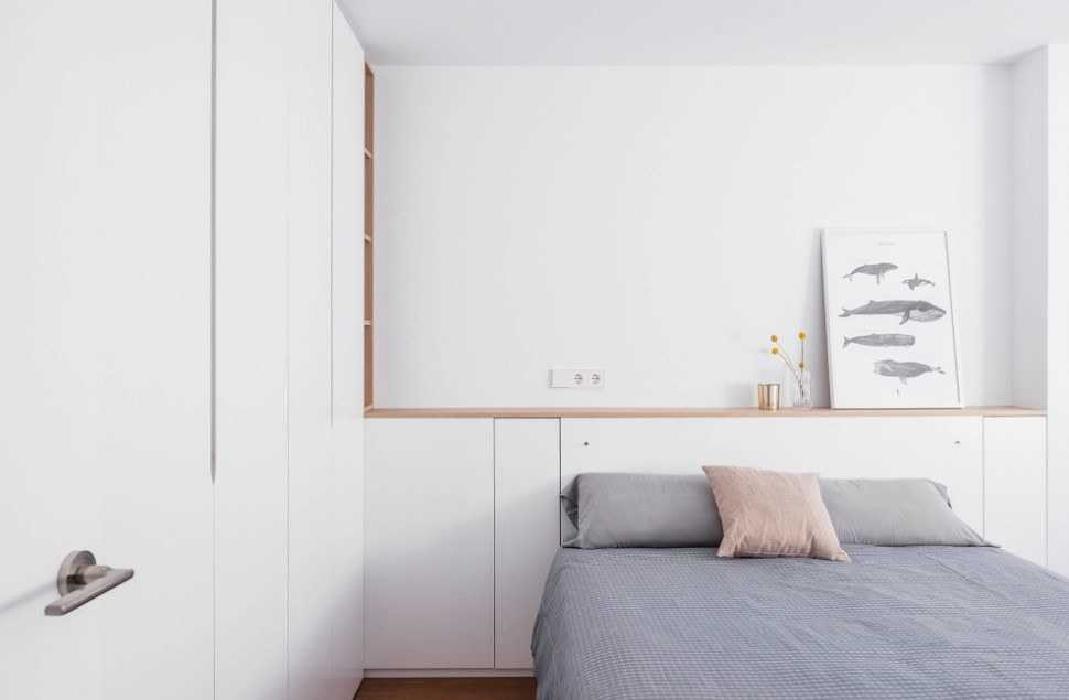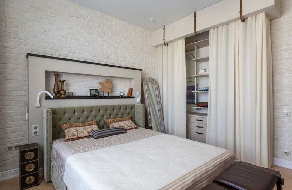Прямоугольную полку можно разместить между двумя шкафами, стоящими по обеим сторонам кровати