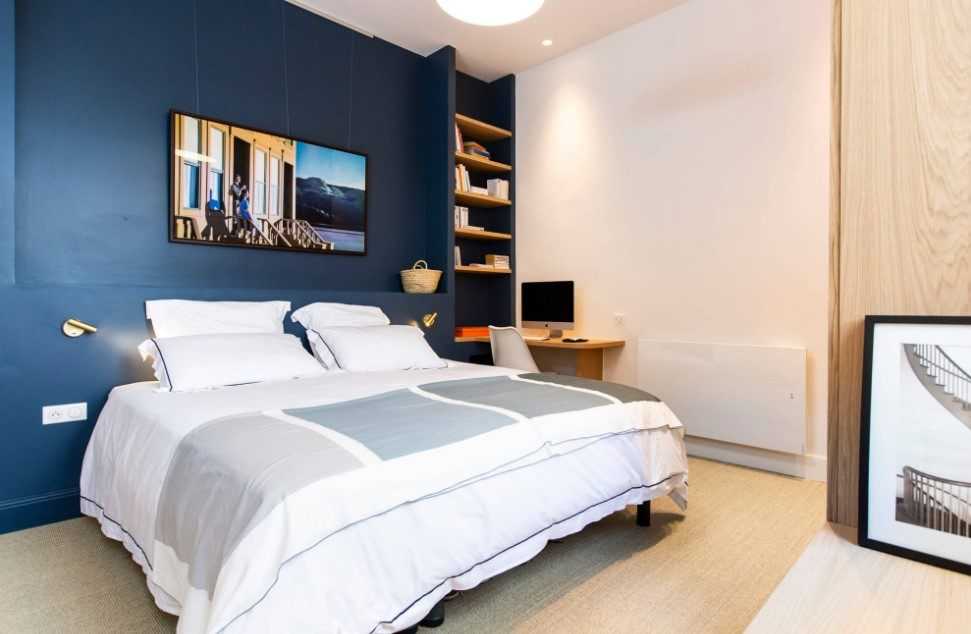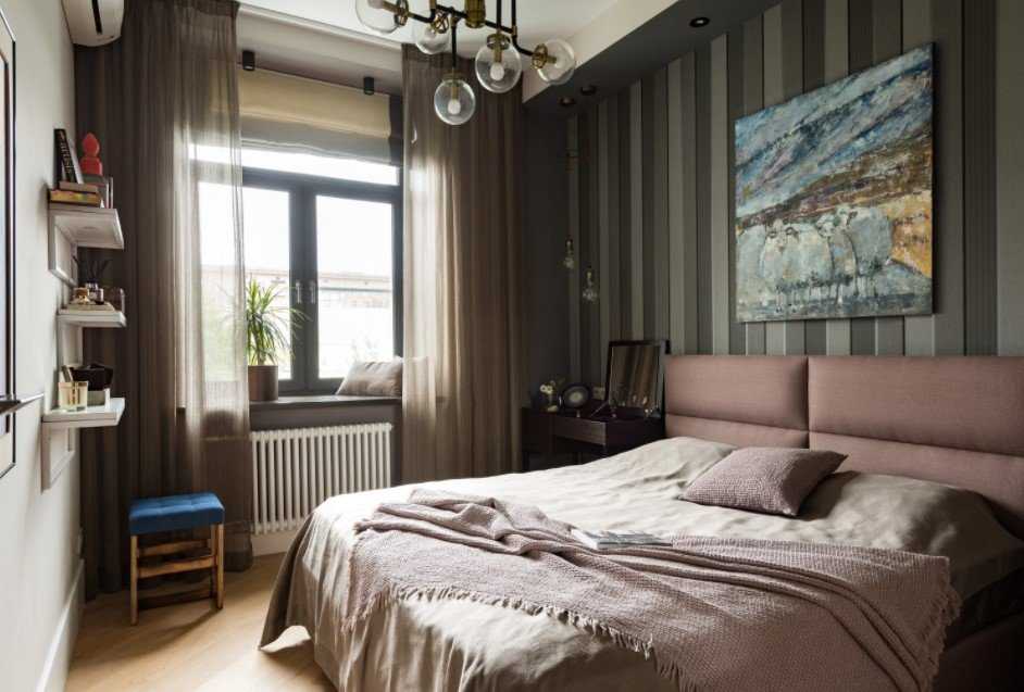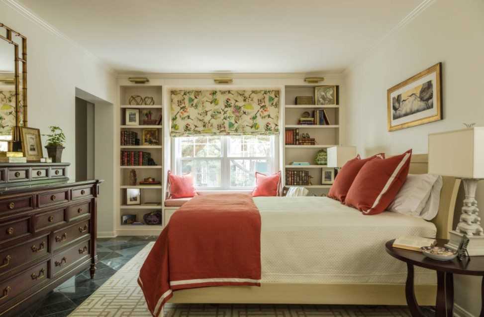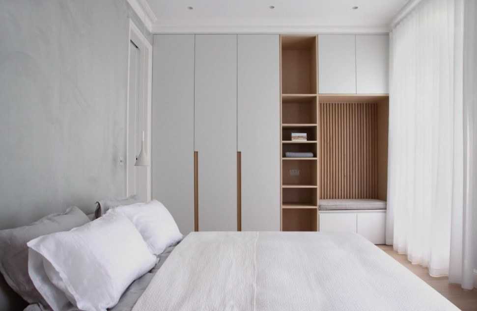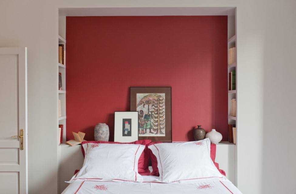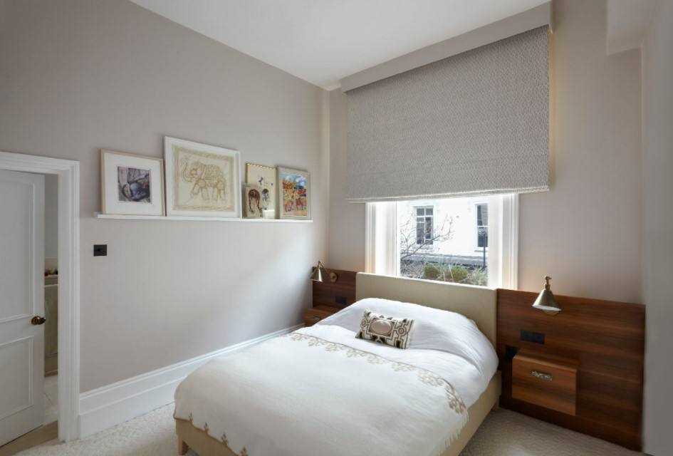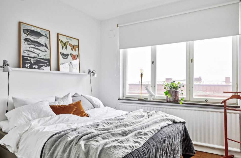 Прямоугольную полку можно разместить между двумя шкафами, стоящими по обеим сторонам кровати