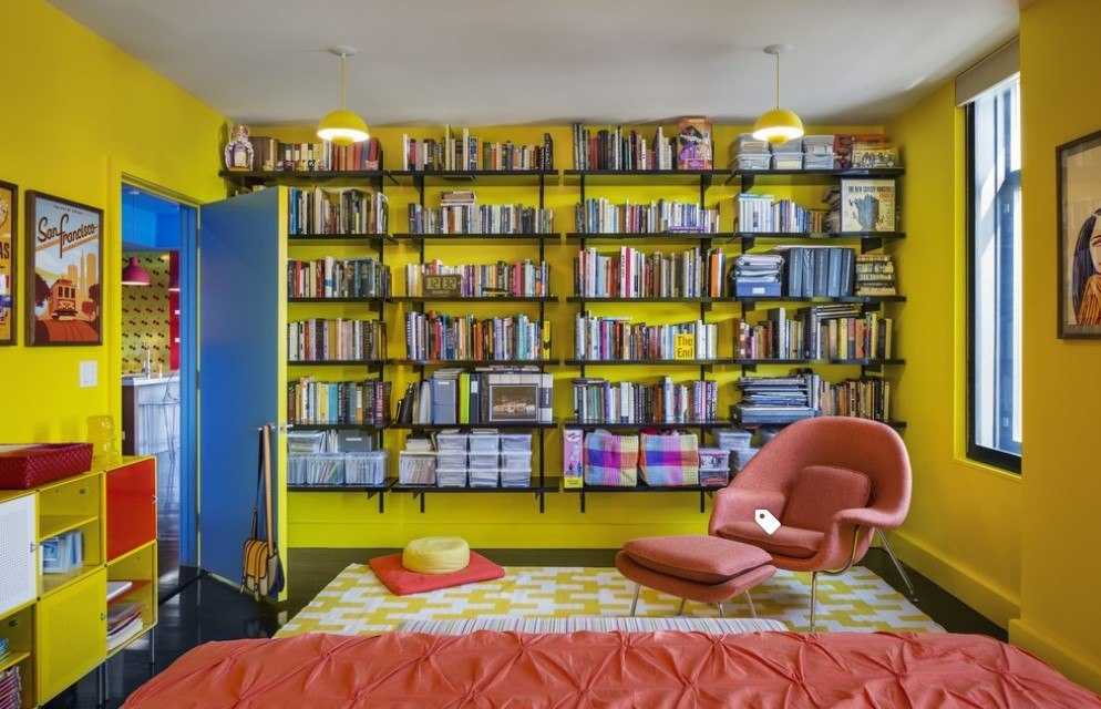 Богатая домашняя библиотека – отличный повод приобрести специальный стеллаж для книг. Пусть его дизайн будет особенным, к примеру, таким, как на фото ниже
