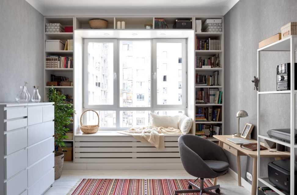 Для более рационального использования свободной площади в помещении, устанавливают конструкции для книг в углу. Такие изделия могут иметь настенное крепление, располагаться на полу или обладать несколькими секциями. Особенно оригинальный вид имеют оконные проемы, обрамленные книгами. Изящная деревянная или пластиковая модель у окна, поспособствует созданию нового интерьерного образа и добавит комнате некую изюминку.