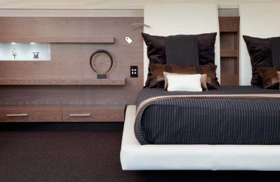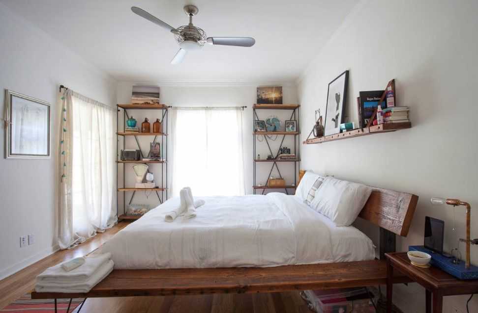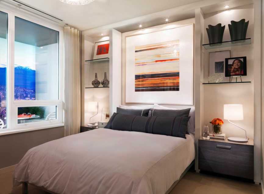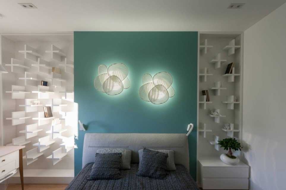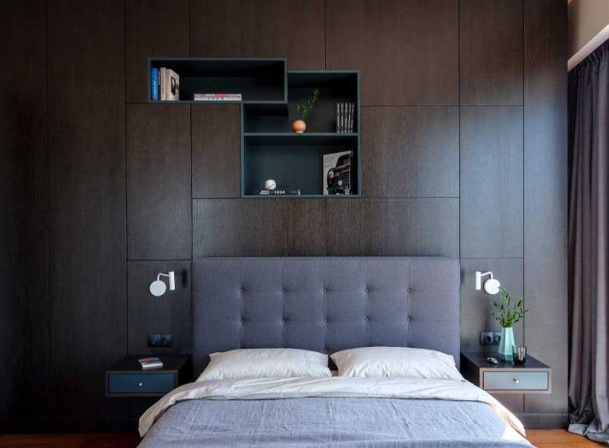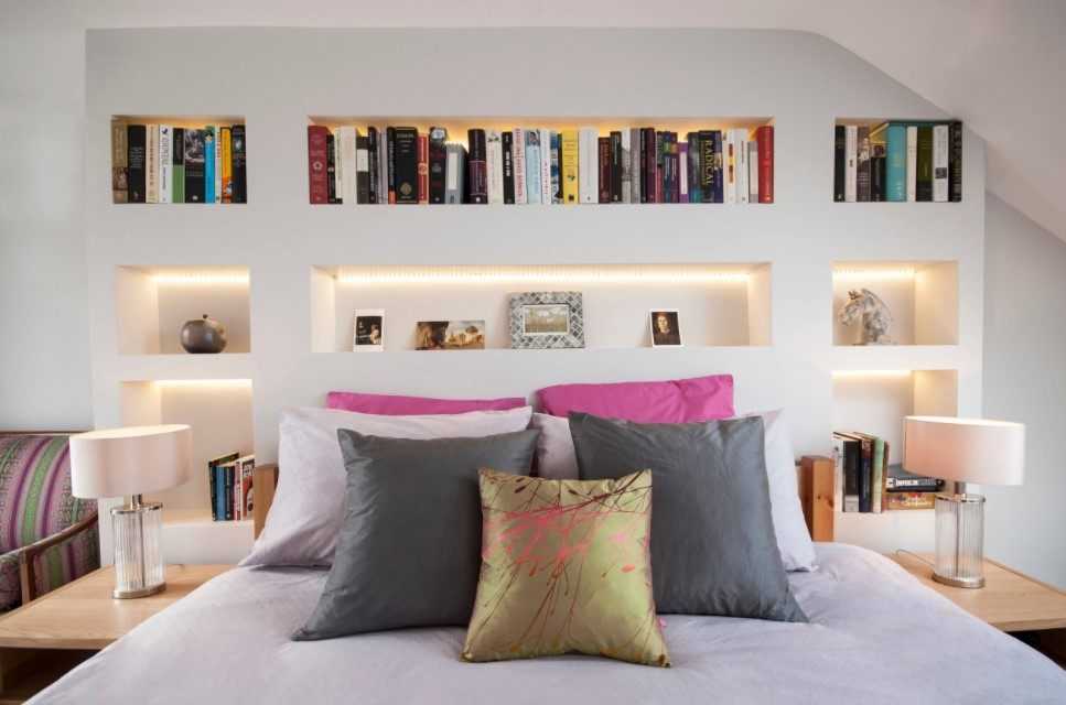Идея размещения полок непосредственно над кроватью в спальне нравится не всем. Однако такое решение считается невероятно удобным для помещений небольшого размера и полки при этом не обязательно крепить к стенам. Это могут быть напольные конструкции, имеющие своё продолжение по обеим сторонам кровати или встроенные вариации, которые смотрятся особенно привлекательно. Такие полочки используются в большинстве случаев для хранения различных мелочей регулярного использования, книг и всевозможного декора. Для более гармоничного вида и удобства, встроенные полки над кроватью оснащаются подсветкой.