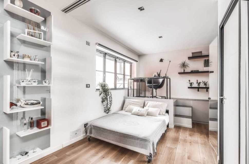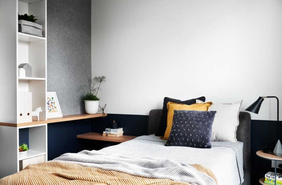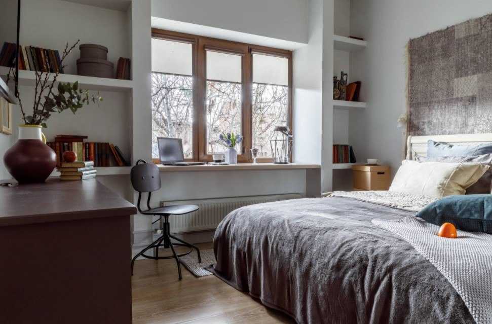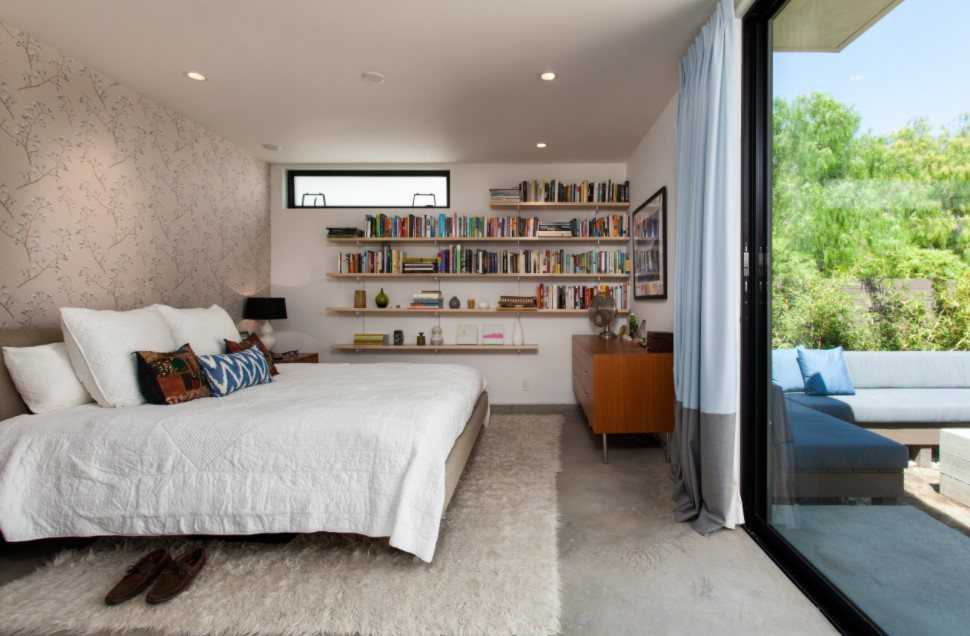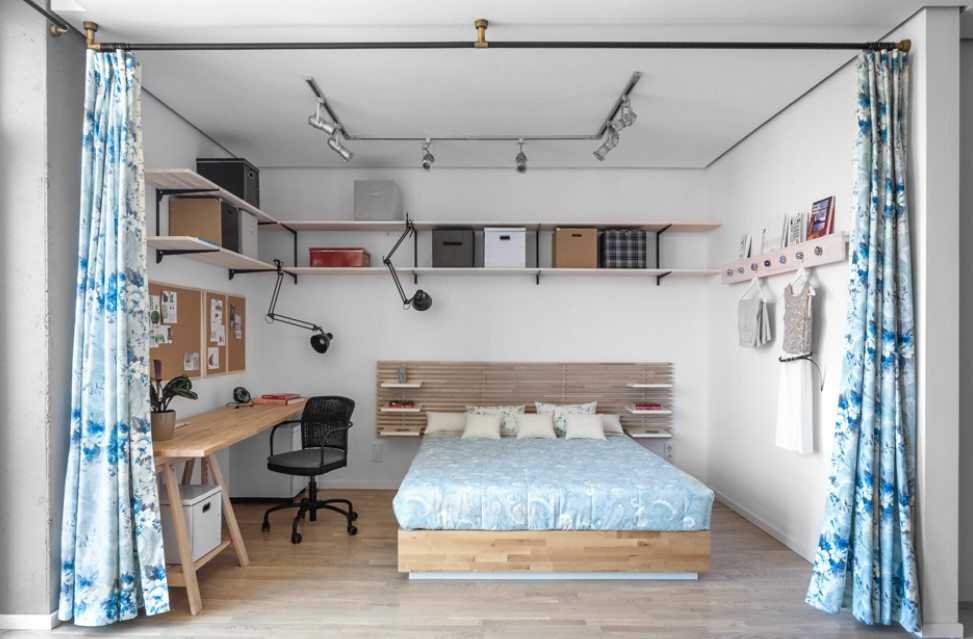 Дизайнеры утверждают, что с помощью простых полок можно разделить свою спальню на несколько удобных зон. Повесив полку между кроватью и рабочим столом, вы поделите комнату на рабочую зону и место для отдыха.