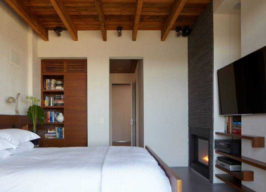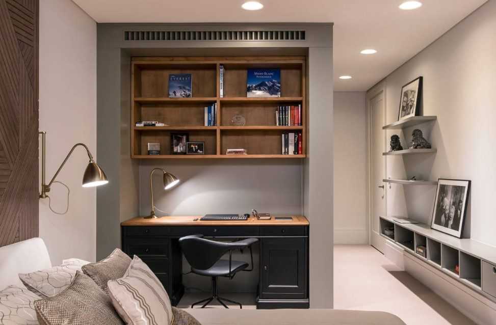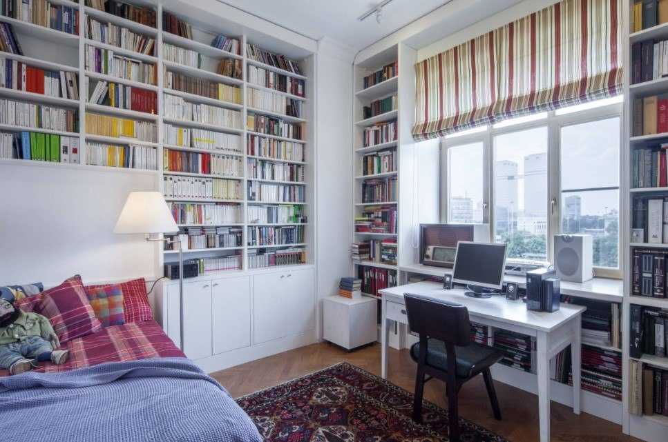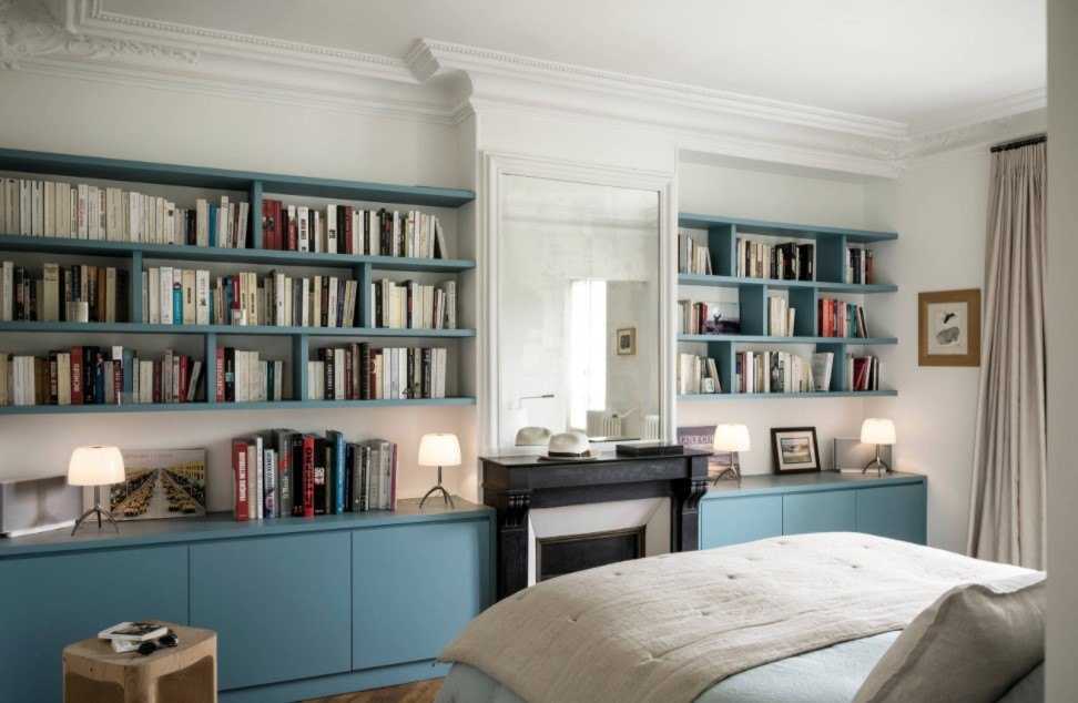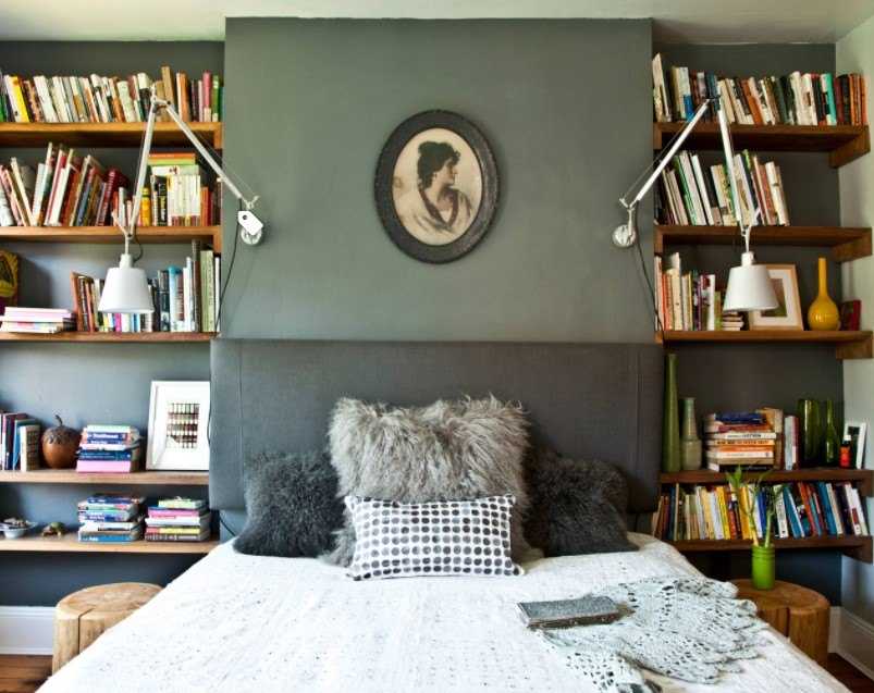 Для придания обстановке особой пикантности, можно расположить полки для книг над камином, разместить их с обеих сторон от очага или телевизора. Созданию стильного дизайна и комфортного чтения перед сном, поспособствуют изделия над кроватью в комбинации с настенными бра. Добиться значительной экономии места, с легкостью получается за счет конструкции, установленной вокруг дверного проема, которая предполагает хранение большого количества изданий.