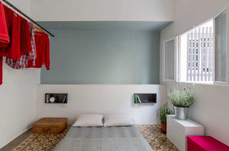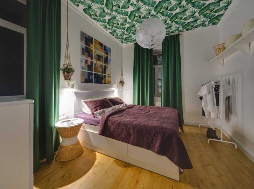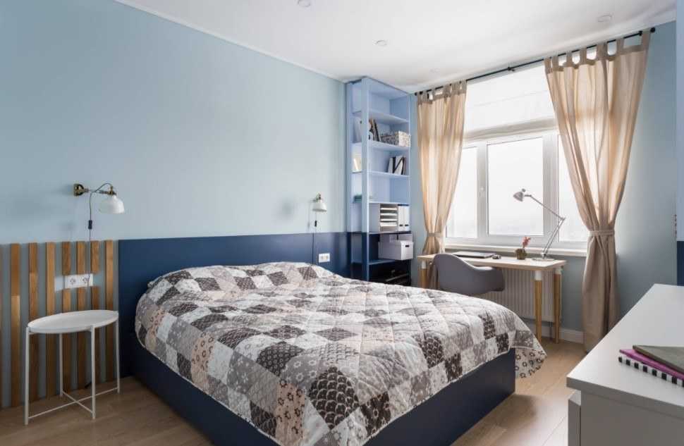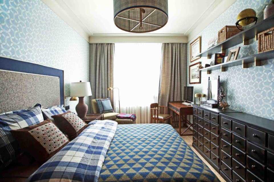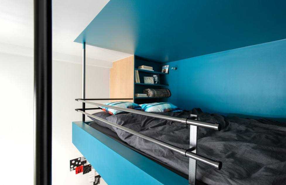 Площадь комнаты на фото ниже составляет всего 8 кв. м, но тем не менее в ней удалось разместить две кровати и комод. Полки и зона хранения вещей вынесены на стену. Практичное решение, которое позволяет значительно сэкономить пространство.
