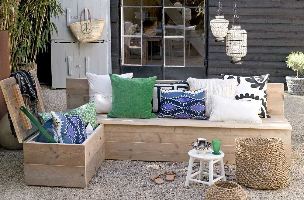 Хорошо смотрятся модели, в которых комбинируются различные материалы. К примеру, лавочку из дерева можно украсить текстилем (подушки, покрывало). Это сделает её по-домашнему уютной и комфортной.
