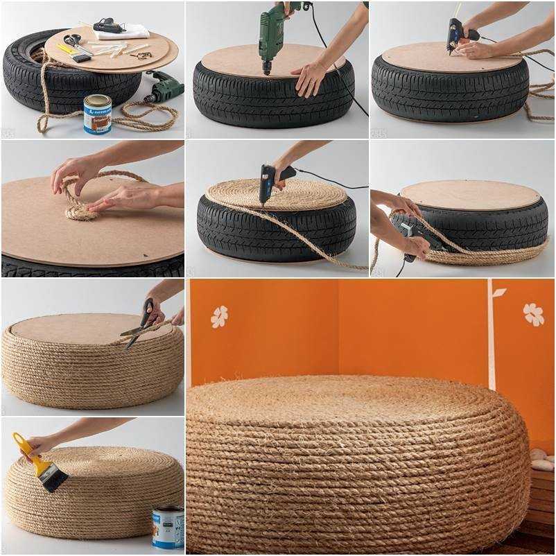 Для ускорения процесса оформления пуфа, перед началом работ оберните мешковиной шину и прикрутите к ней фанеру. Затем приступайте к обивке веревкой. Если не использовать мешковину берется только веревка и с помощью клея приклеивается на центр листа МДФ. Далее следует двигаться по кругу, пока не дойдете до шины. По той же технологии необходимо покрыть и боковые поверхности.
