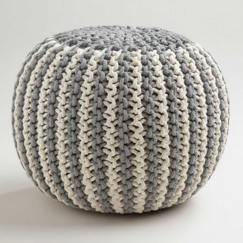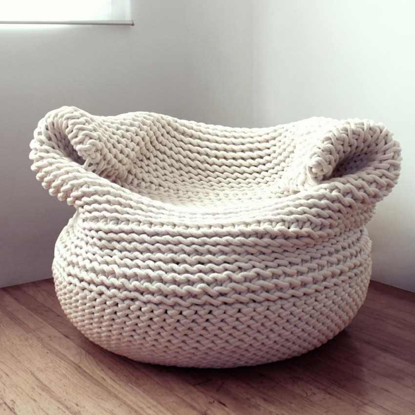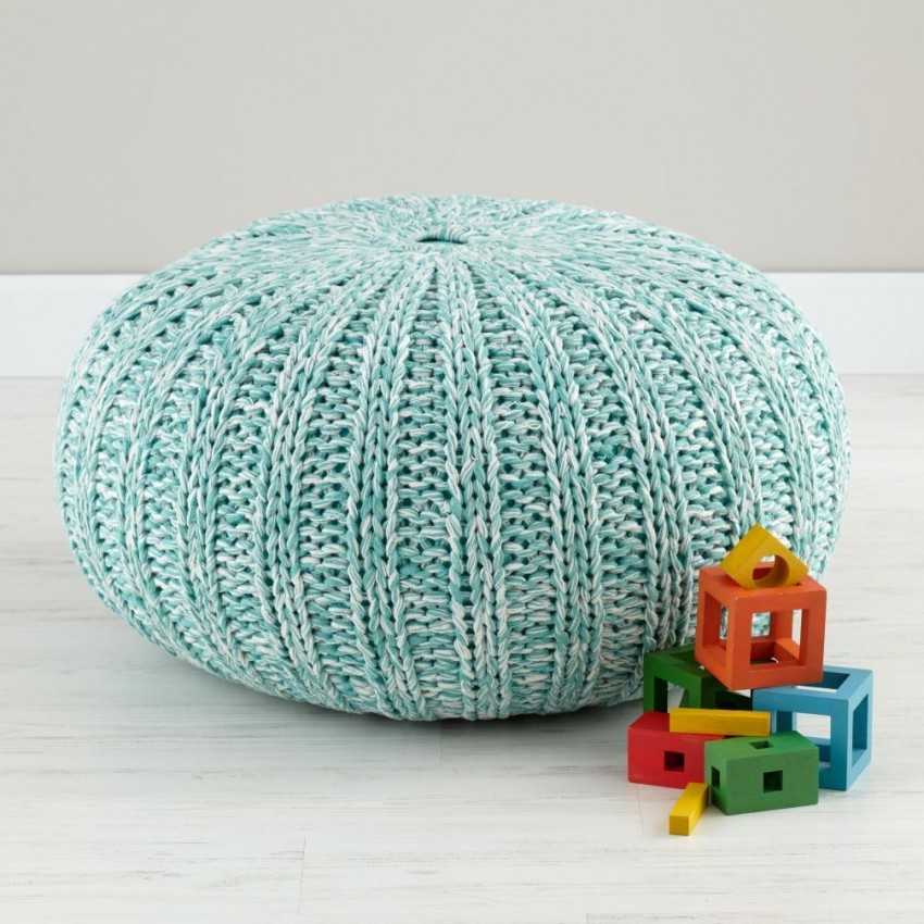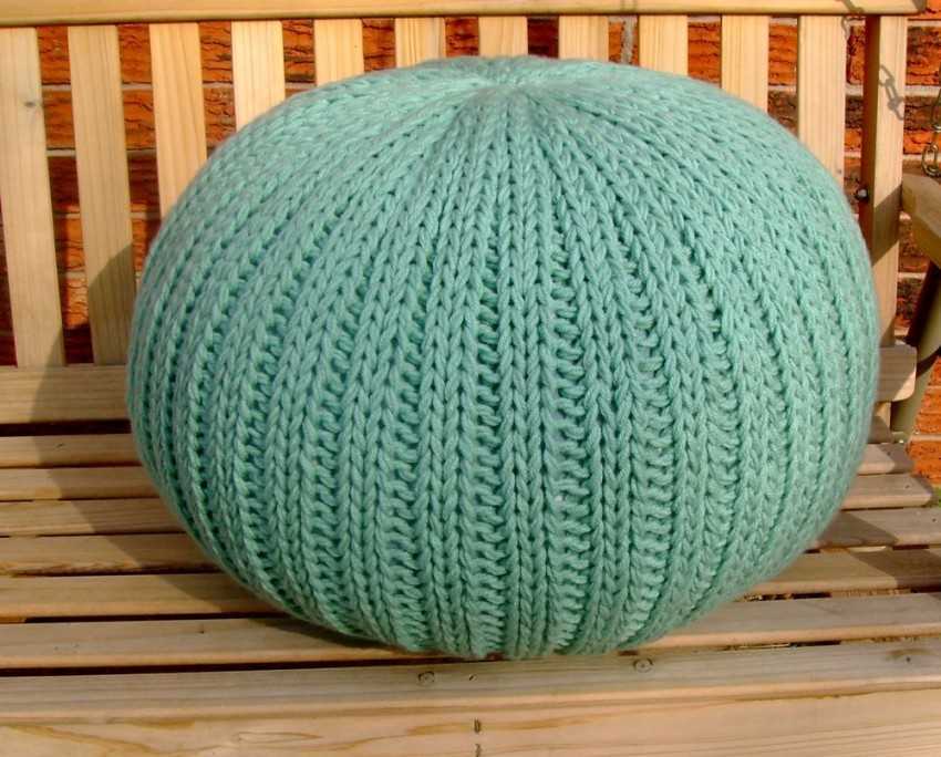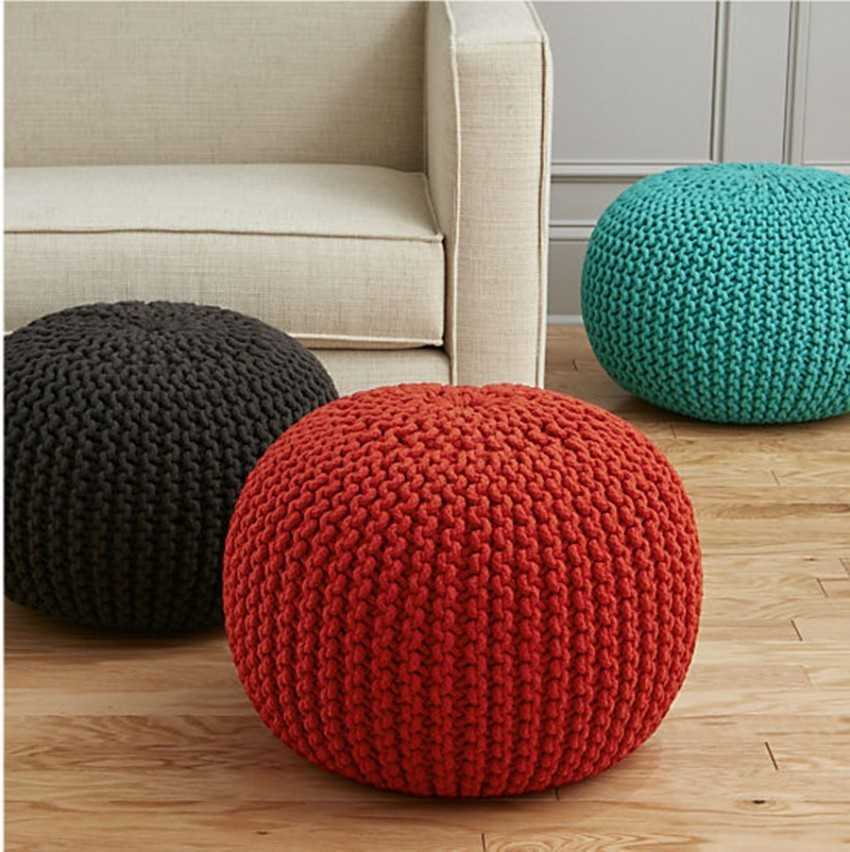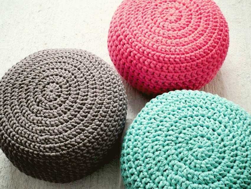 - Трикотажная пряжа. Легкие изделия можно перемещать в нужное место. Сделать пуф довольно легко, однако, он получается довольно маленький. Если таким изделием пользуются дети, то можно не волноваться. Пораниться об пуф невозможно.