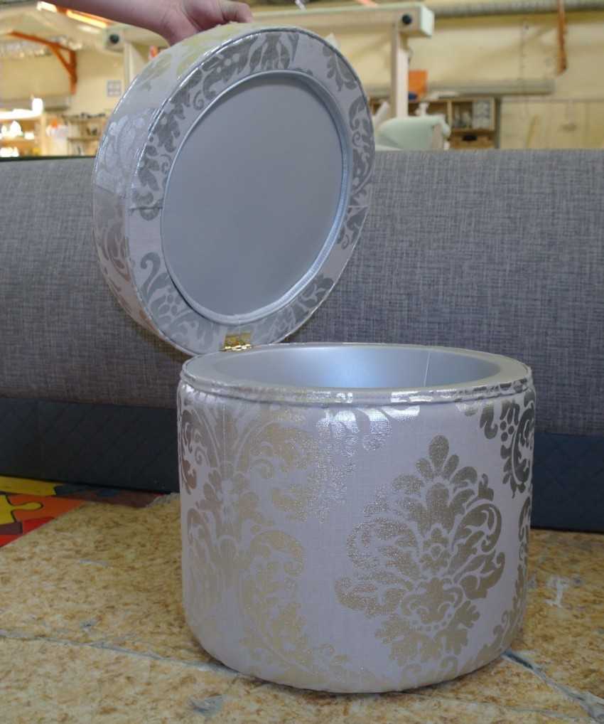 Стенки и крышку покрывают обивочной тканью. Крепят её с помощью степлера. Чтобы скобы хорошо закрепились на расстоянии 2 см от верха по внутреннему периметру короба и снаружи по периметру днища на таком же расстоянии от края саморезами прикручивают бруски сечением 15–20 мм. К этим брускам крепят обивку.