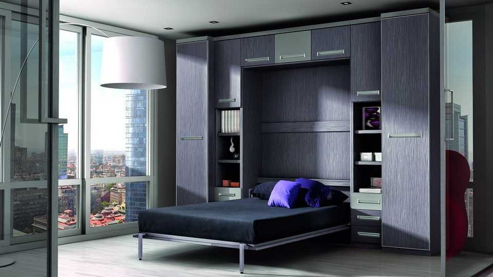 - Встроенная в шкаф. Часто это единственный вариант для небольших спален. Днем кровать поднимается вертикально, «маскируясь» под шкаф, ее днище превращается в дверцу.