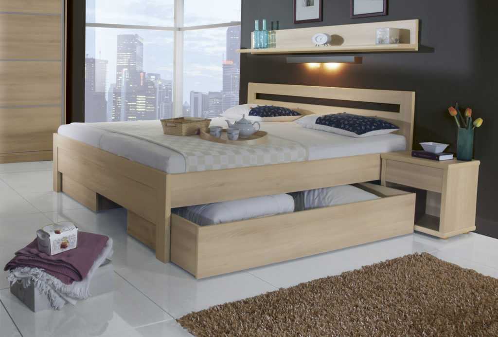 Помимо стандартной комплектации, двуспальная кровать может иметь определенные конструктивные особенности. Популярные модели: