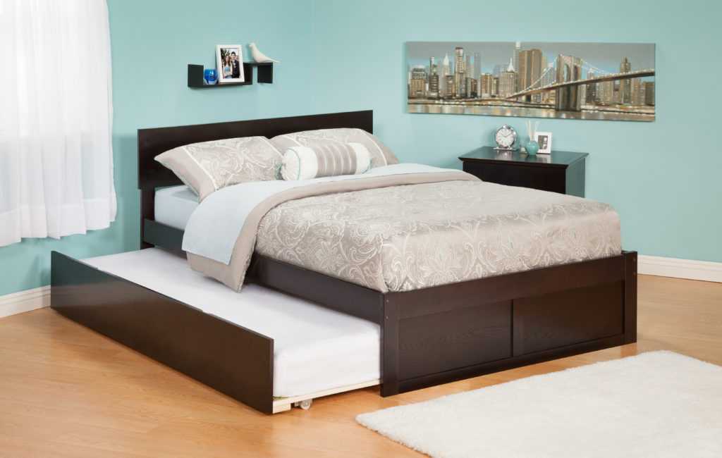 - Кровати для двоих взрослых раздвижного типа. Изделия подойдут для небольших комнат с квадратной или прямоугольной планировкой. Чтобы получить широкое ложе, надо выдвинуть из-под основания собранной модели нижний блок и установить обе половинки на одном уровне.