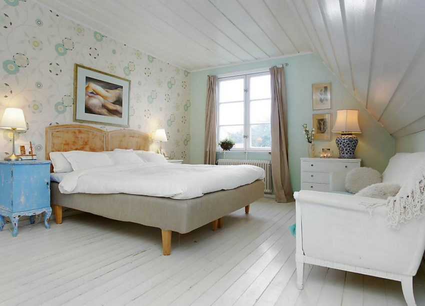 Отличительные черты спальни в скандинавском стиле — нарочито грубое дерево и исключительно натуральные материалы. Комната светлая, удобная и просторная. В отделке стен часто используются светлые тона, а в качестве напольного покрытия — ламинат. Оживить интерьер можно с помощью пушистых ковриков или покрывала в стиле пэчворк.