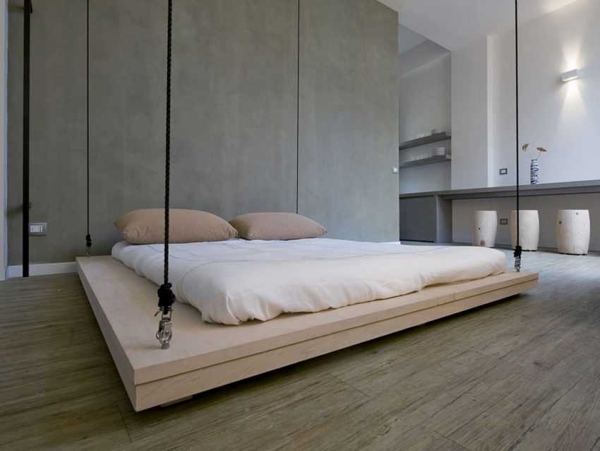 Создание спальни в стиле лофт предполагает покрытие стен грубой лепниной или наличие кирпичной кладки. В основе такого интерьера — контраст холодных цветов и фактур, самодельные и оригинальные элементы декора, наличие больших высоких оконных проемов и максимум свободного пространства. Для отделки потолка оптимальна серая доска и белая покраска.