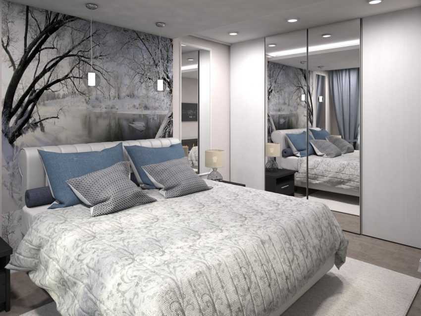 Основное требование к дизайну такой спальни – визуально расширить пространство. Его можно увеличить за счет светлой цветовой гаммы, использования зеркальных и отражающих деталей.