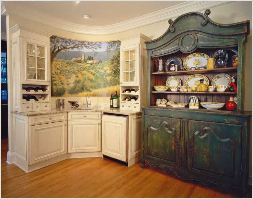 Альтернативное решение — сделать акцент как раз на старинном характере буфета. Стилистика прованса подчеркивается при помощи специально созданных потертостей. Сформировать их можно несколькими способами: