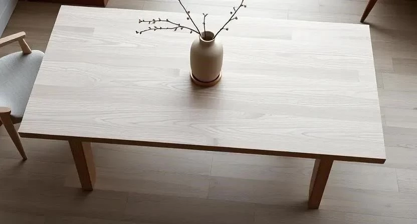 - Скандинавский стиль: Светло-серый стол из натурального дерева с простыми формами.