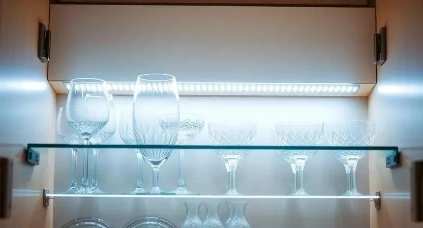 - Кухонные шкафы: Важно выбирать влагостойкую подсветку, особенно для шкафов, расположенных рядом с мойкой.
