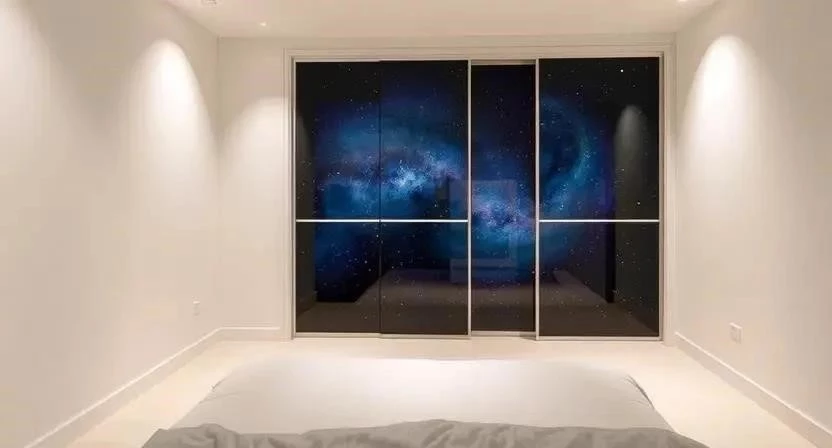 Шкаф с эффектом галактики в спальне с минималистичным дизайном.