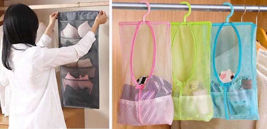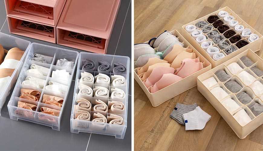 Приспособления для хранения нижнего белья в шкафу особенно популярны. Изготавливаются из плотного картона, разноцветного пластика, лозы, флизелина. Могут быть связаны или обшиты тканью.