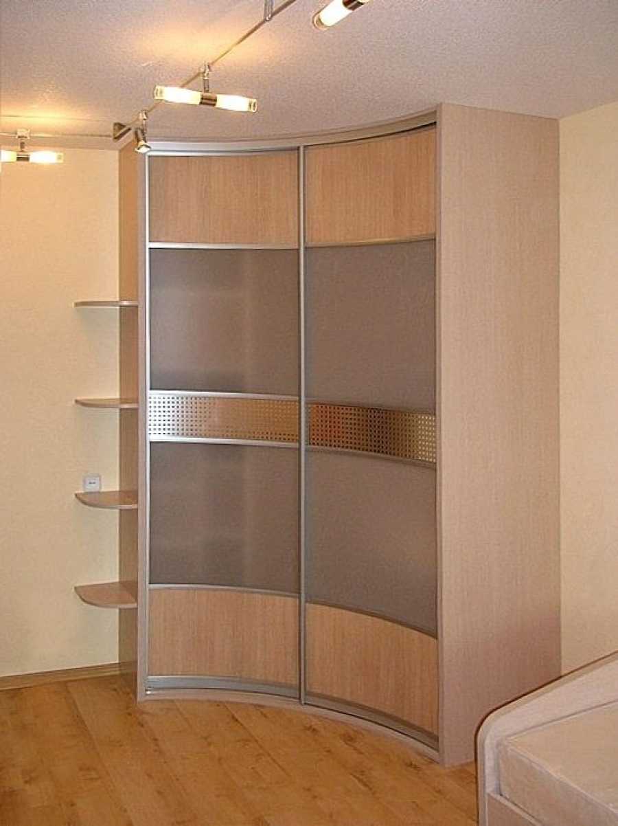 радиусный шкаф для спальной обладает вычурным дизайном, высоким уровнем вместительности, но стоит дорого. Поэтому подбирать его под маленькую спальню может быть нерационально;