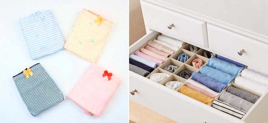 Обычно для нижнего белья принято выделять отдельный ящик в шкафу или комоде. Трусы складывают любым удобным способом: рулетиком, квадратиком или в виде кармашка.
