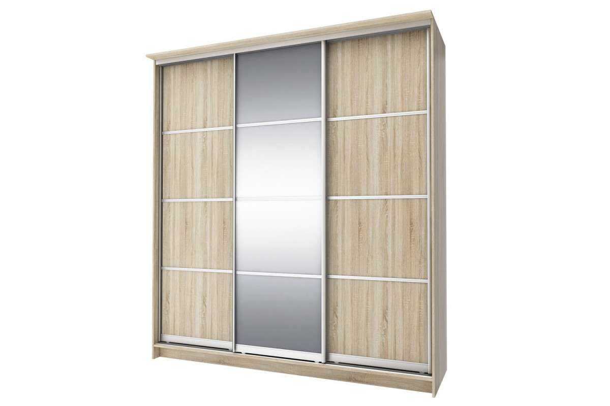 Покрутиться перед зеркалом можно и с моделью Миррор от фирмы Комфорт. Каркас собран из листов ЛДСП с фигурными зеркальными вставками на фасаде. Внутри 2 отдела: с бельевыми полками, а также с выдвижной штангой и полочкой для головных уборов. В качестве дверной фурнитуры использована система направляющих СКМ-80. В дополнение можно заказать цветную LED-подсветку. Высота шкафа 190 см, но у производителя есть возможность изготовления мебели более 240 см.