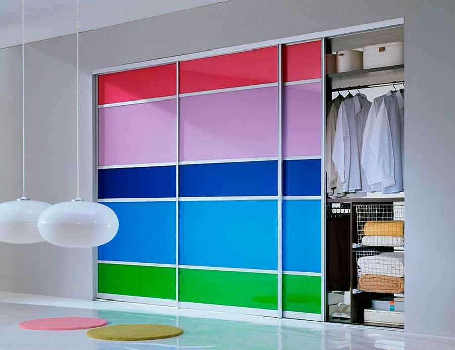 Интенсивно раскупаются и шкафы с разноцветными вставками. Здесь нужно помнить, что такие вставки должны подходить под окружающую обстановку. Популярными решениями становятся красные, желтые, фиолетовые, голубые оттенки. Выглядит готовая модель довольно необычно, но интересно. Хорошо подходит цветной вариант к спальне или детской комнате, где обычно много ярких красок.