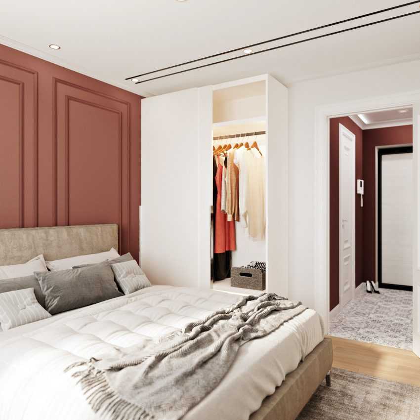 Встроенный шкаф несколько массивно выглядит в комнате с высокими потолками, если, конечно, не снизить его конструкцию, добавив еще один уровень, но это потребует дополнительных средств.