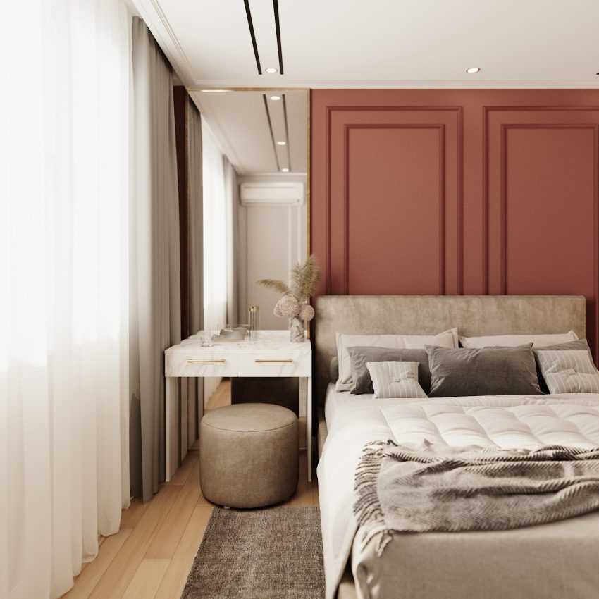При рассмотрении вопроса о том, как оптически увеличить спальню, обратите особое внимание на углубление в окне. Если у вас нет проблем с засыпанием в мягком свете, не закрывайте окно затемненной шторкой, которая захлестнет пространство. Выберите нежный и воздушный занавес. Это позволит вам использовать туалетный столик без специальных светильников по утрам