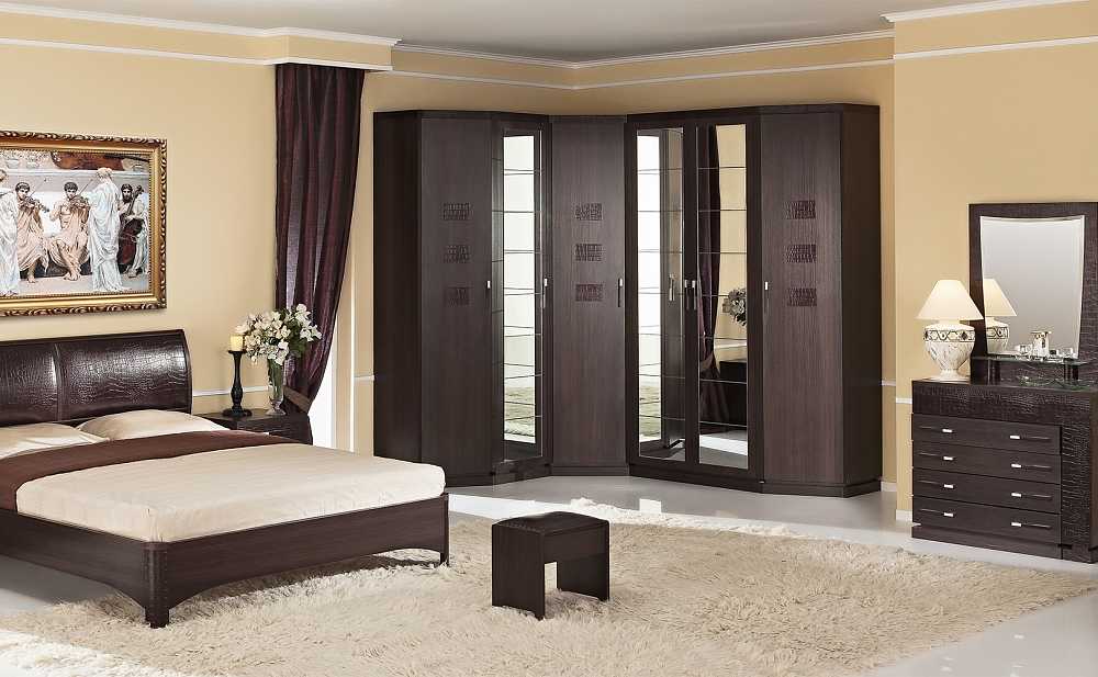 Если интерьер достаточно большой по площади, то допустимо установить темный спальный гарнитур с прикроватными тумбочками и настелить пол из венге, что добавит благородства.