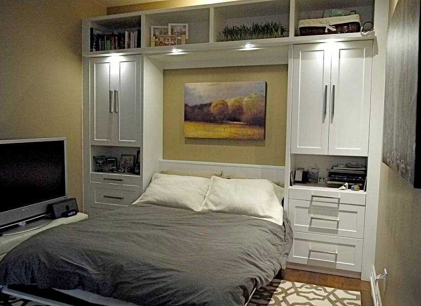 Гардероб по двум сторонам кровати и над изголовьем отлично экономит пространство, делает функциональным каждый его сантиметрИсточник avatars.mds.yandex.net