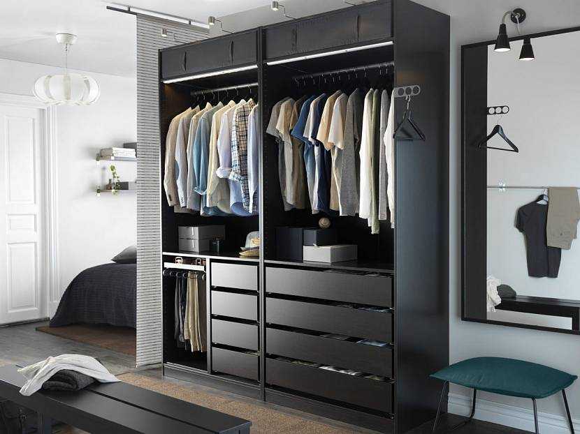 Это может быть платяной шкаф. Но у разработчиков бренда ИКЕА шкафы всегда необычны. Их модули могут переставляться, разбираться и собираться вновь, раскладываться и складываться. Шкаф-купе Пакс с отделами для вешалок и полками для джинсов и футболок может быть нескольких видов: