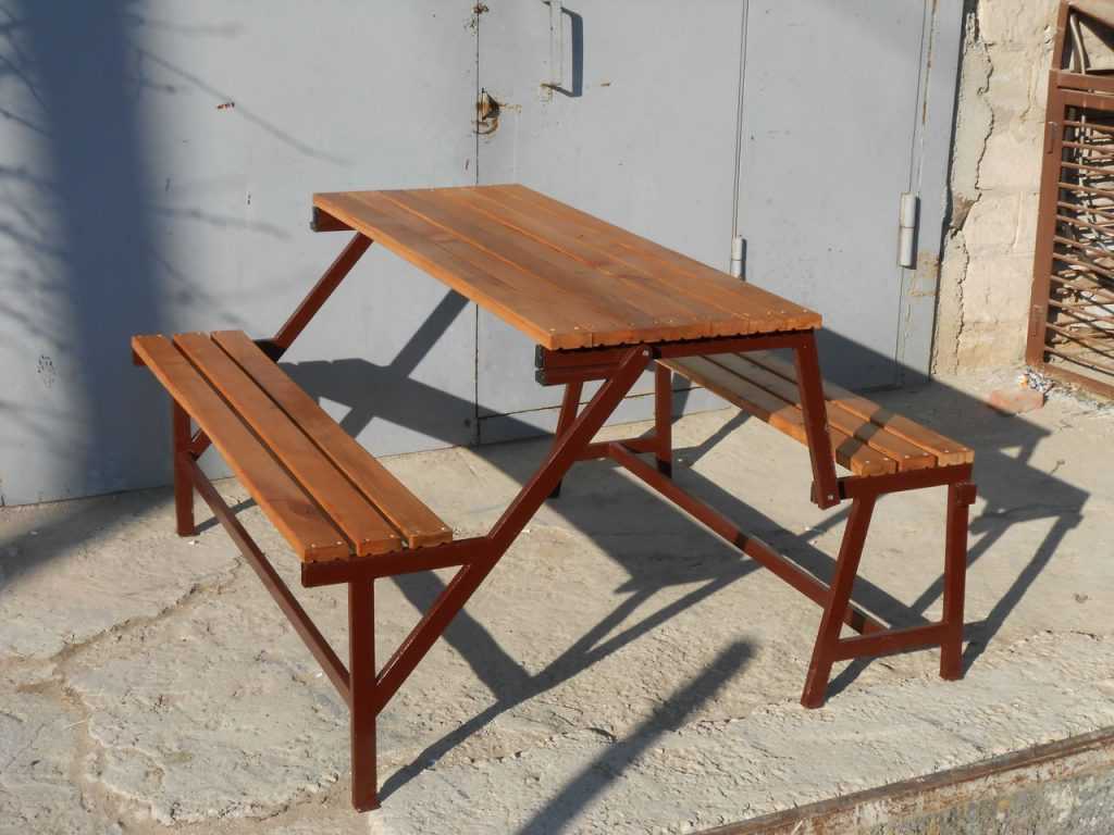 - Столик для пикника. Имеет множество модификаций. Это самый распространенный предмет, который чаще всего изготавливают своими руками. Столешница может быть поворотной, иметь круглую или прямоугольную форму. Крепится она к рамам, которые позволяют легко приводить конструкцию в нужное положение.