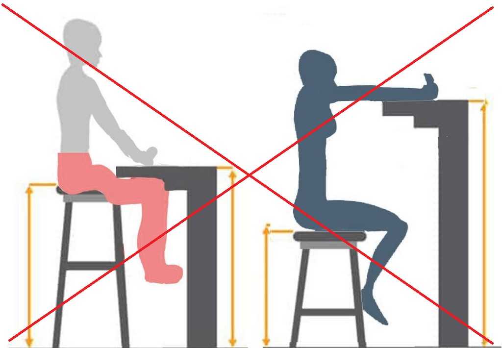 - Следующая распространенная ошибка – неправильно подобрана высота стульев. О том, как не допустить такую ошибку, мы подробно писали выше в отдельном пункте.