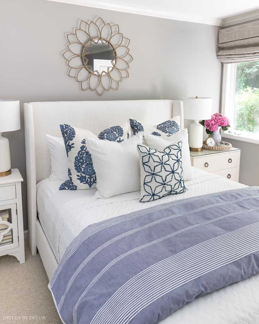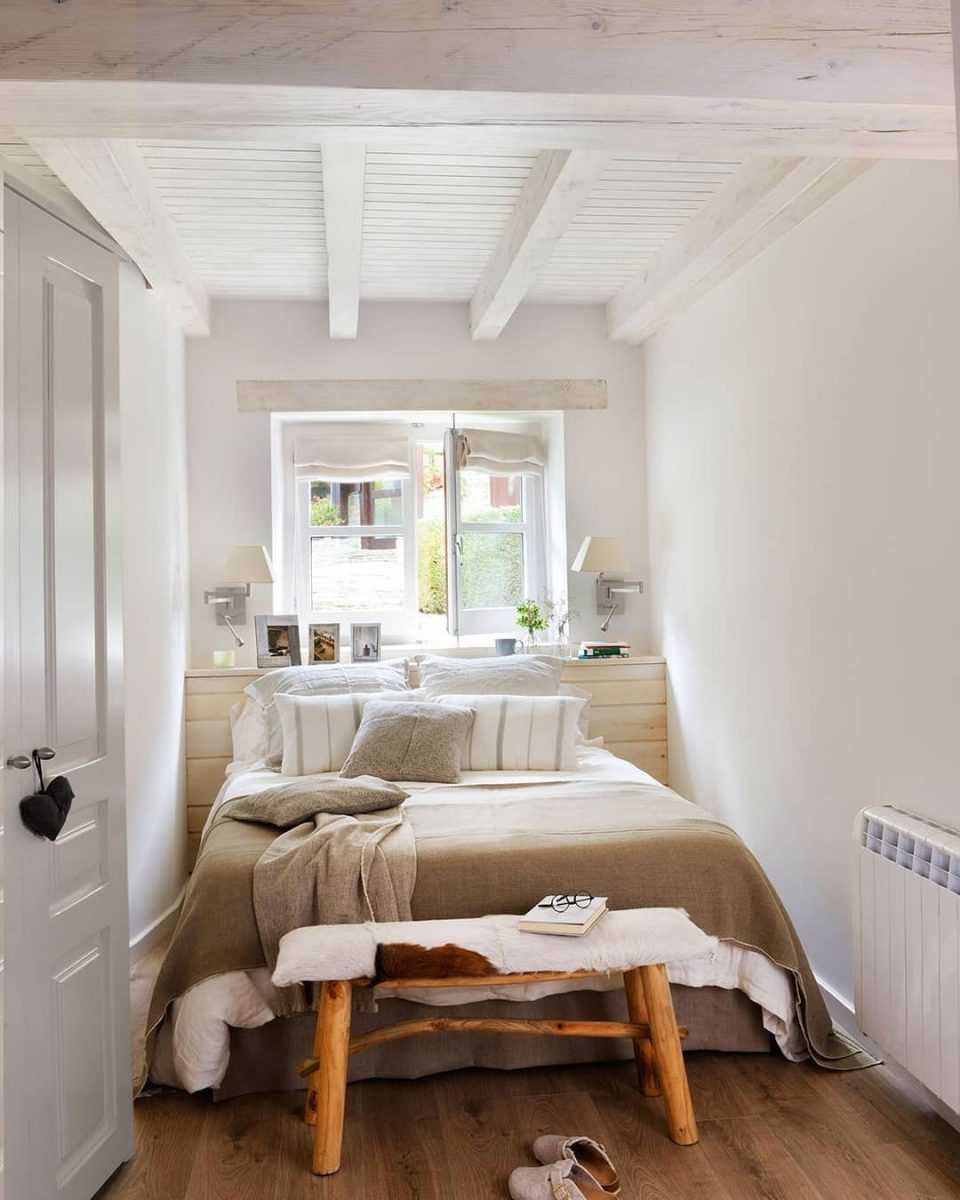Светлая мебель, стены, полы, окна и постельное белье делают маленькую спальню больше. Большой ковер поможет закрепить пространство в интерьере. Выбирайте для соответствия прикроватные тумбочки и лампы, которые простираются до большей части стены, и комод и стул на противоположной стене. Это классическая, надежная планировка спальни, которая работает у каждого. В спальне, которая длинная и узкая, может быть заманчиво разместить кровать в конце, но попробуйте центрировать ее на длинной стене вместо этого.