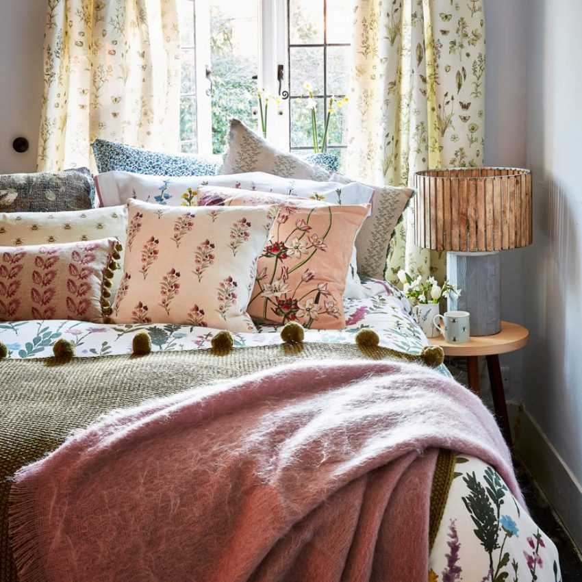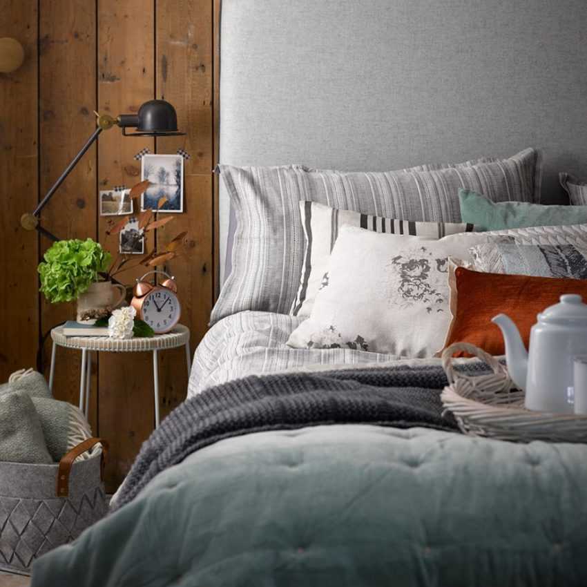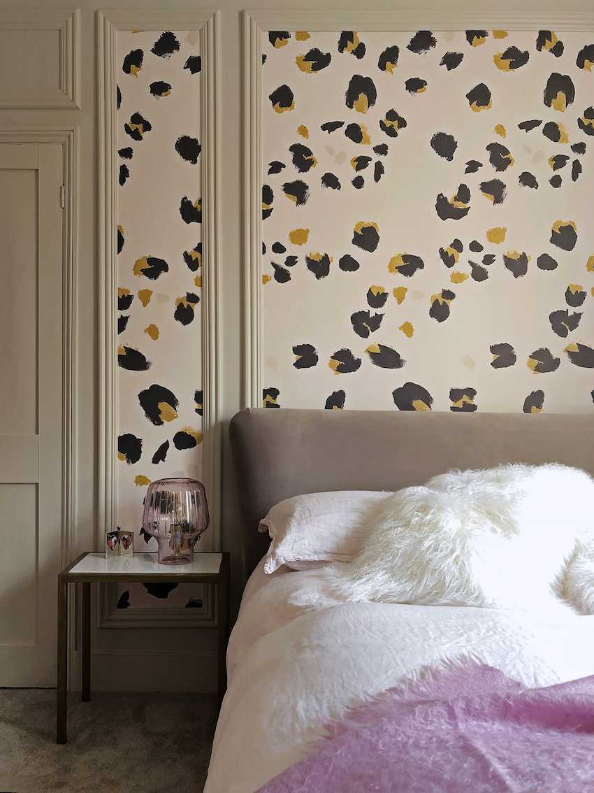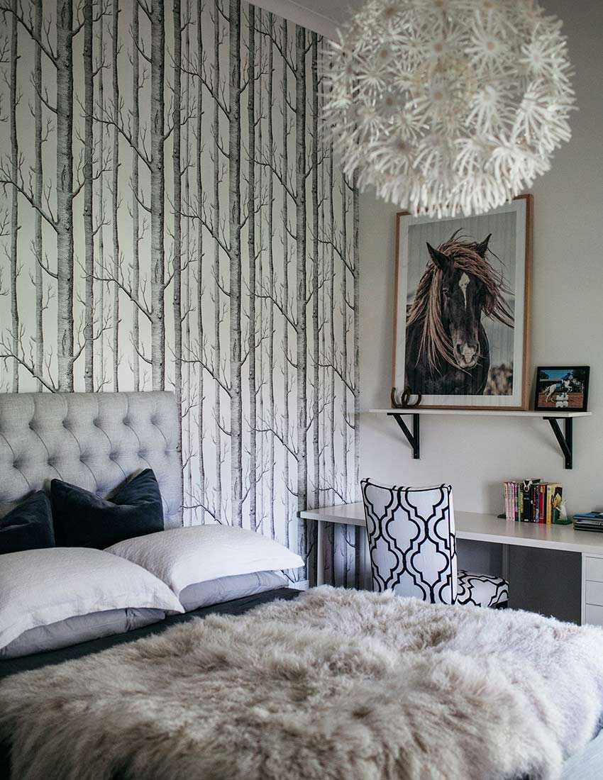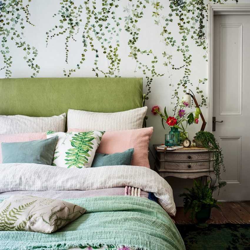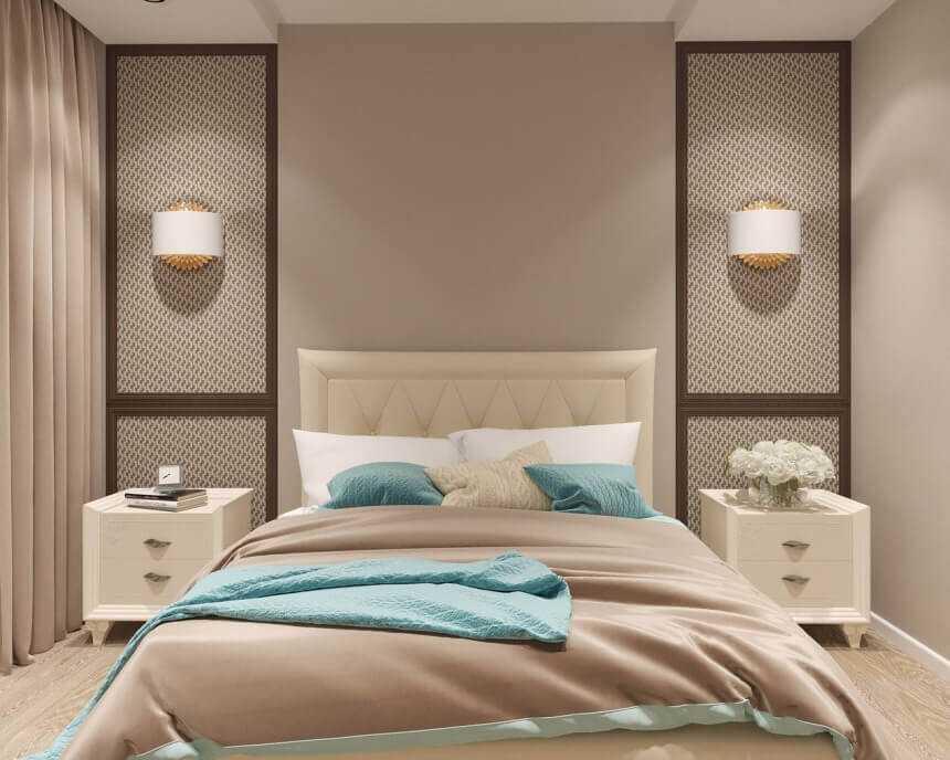 Для спальни с однотонными стенами изголовье кровати может быть фактурным или с принтом — геометрическим, растительным. Но если зона у изголовья кровати оклеена обоями с рисунком, то кровать должна быть однотонной.