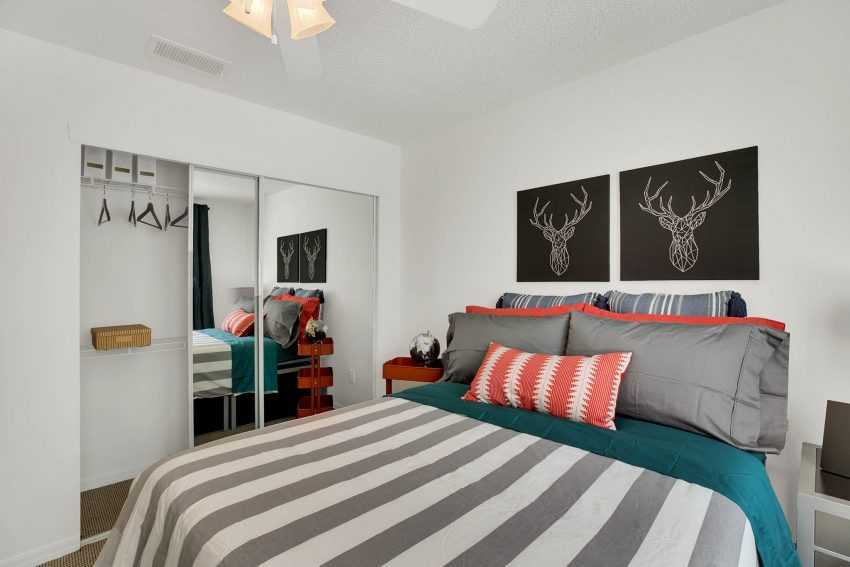 Можно выбрать раскладной диван, сложенный он занимает меньше места у стены, не перегораживает комнату. В маленькой комнате от обычного шкафа лучше отказаться в пользу изделия с раздвижными дверцами — шкафа-купе. На фото пример оформления маленькой спальни.