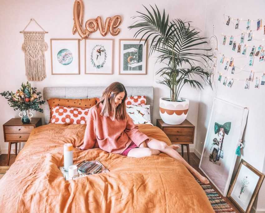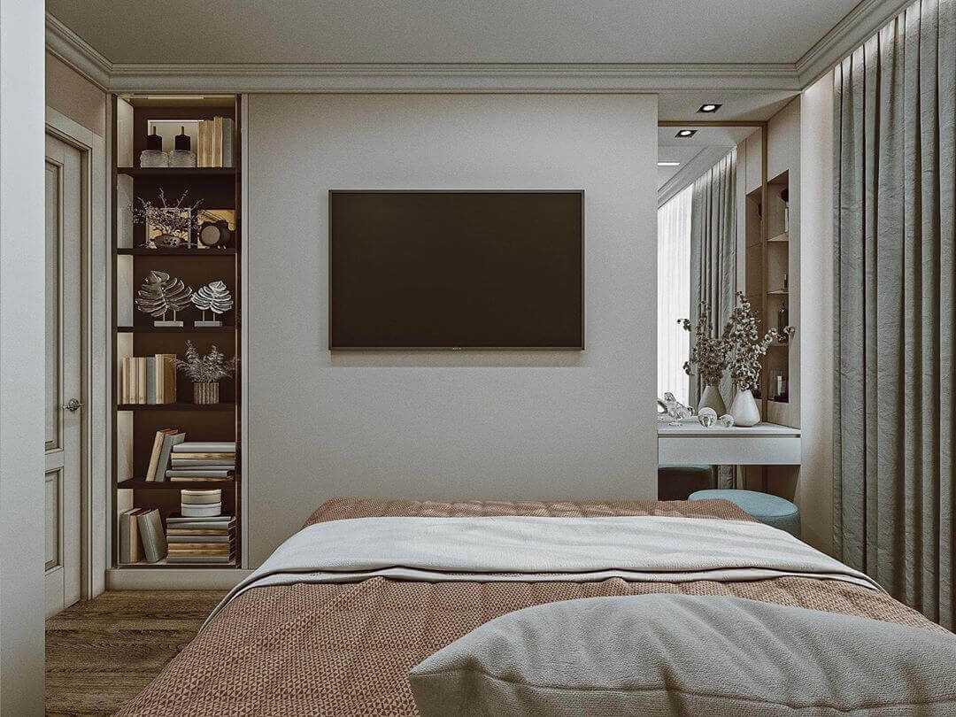 Телевизор в спальне необязателен. Его чаще смотрят в гостиной или на кухне. Если он необходим, его можно повесить на стену напротив кровати или на кронштейн в середине комнаты.
