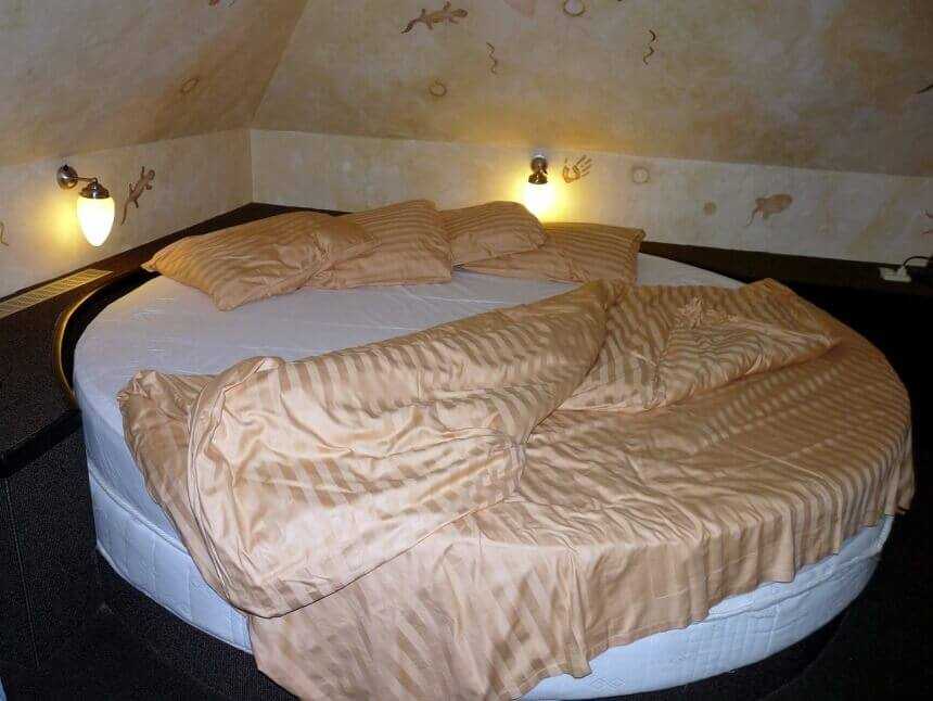 Достаточно популярными стали кровати без изголовья полукруглой формы, а также круглые, в виде большого пуфа. Они интересны с точки зрения дизайна, необычны. Хорошо подходят для интерьера спальни большого размера. Но усложняется подбор постельного белья — его следует шить на заказ.