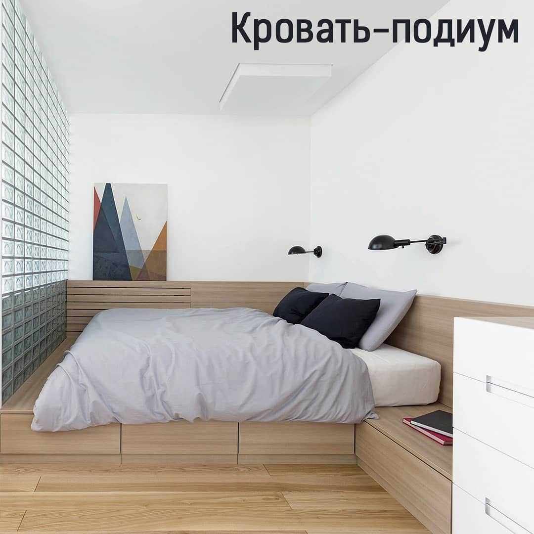 Если место позволяет, по бокам кровати устанавливают прикроватные тумбочки. Их можно сделать высокими. Это выглядит необычно, но очень удобно: образуется дополнительное место для хранения вещей. Вместо прикроватных тумбочек можно повесить полочки на стену. С ними появится ощущение легкости.