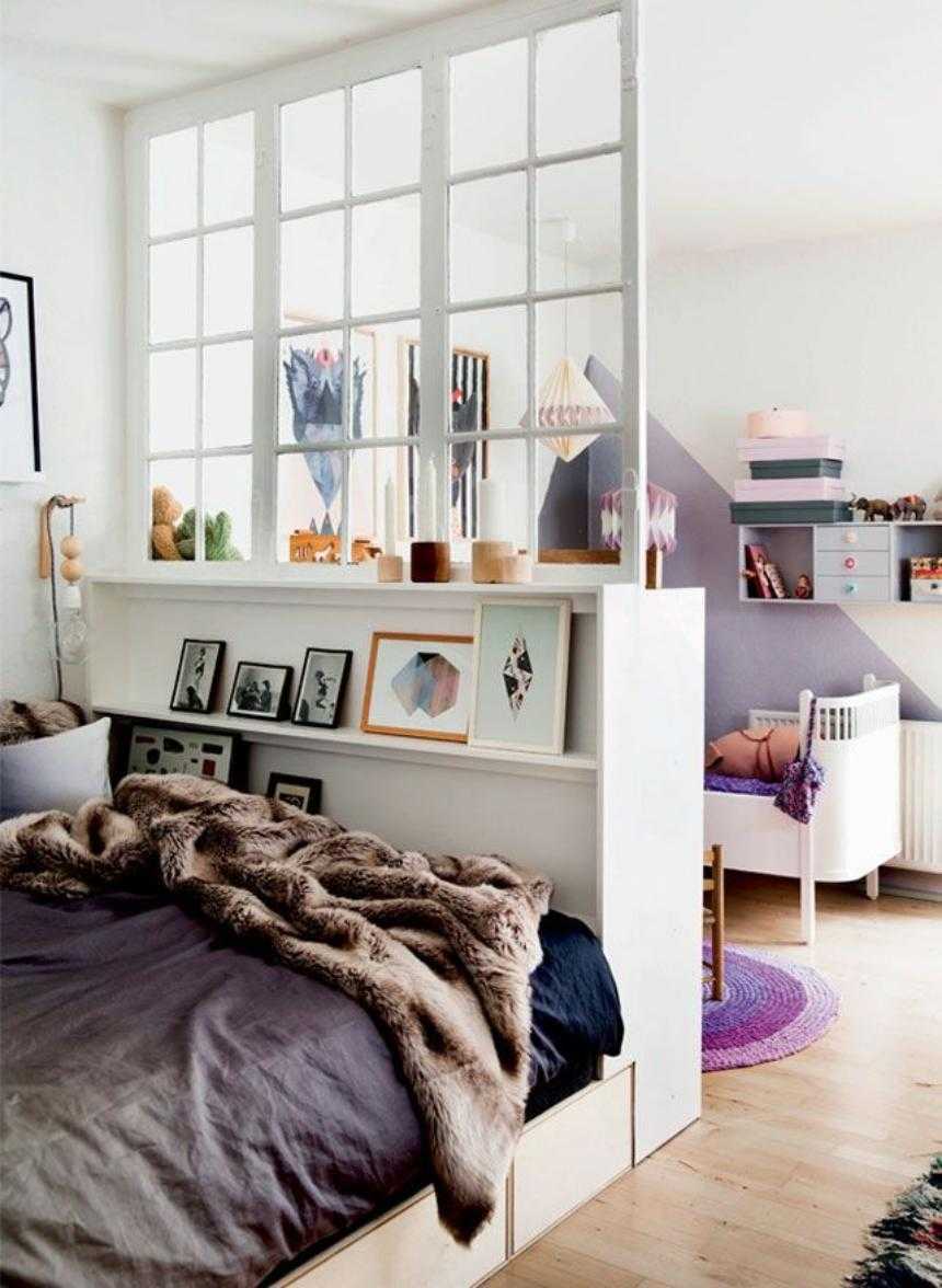 Если без прикроватной тумбы или столика трудно обойтись, то стулья можно заменить небольшими пуфиками. Если одна комната должна выполняет несколько функций, поможет зонирование пространства с монтажом лёгких передвижных ширм.
